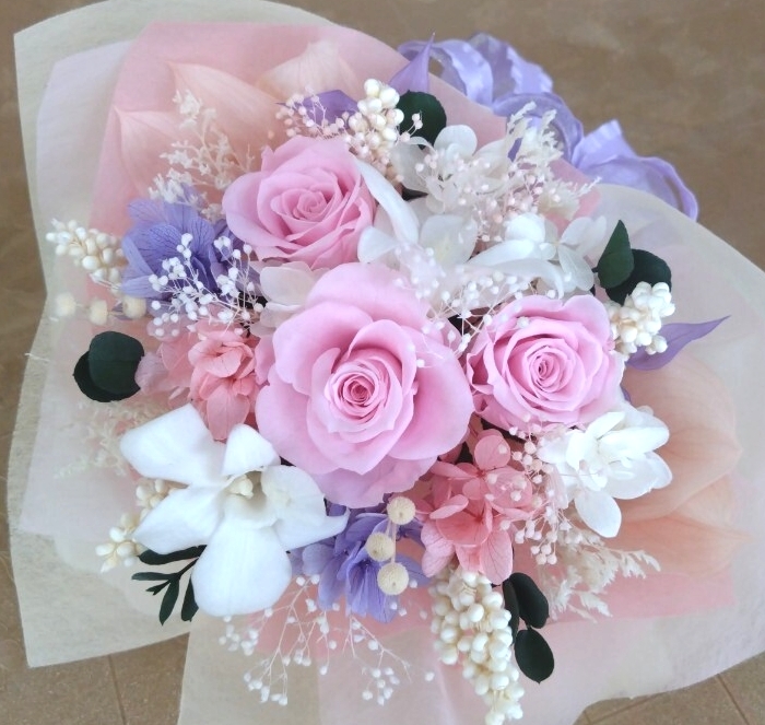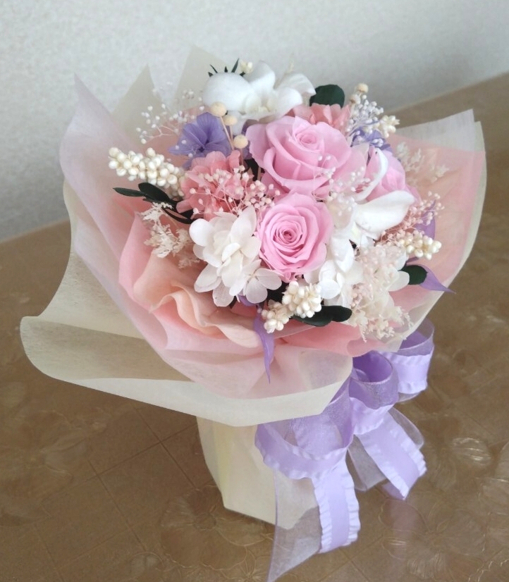 プリザーブドフラワーは、生花のような華やかさを保ちながら長い間楽しめるとてもデリケートなお花でございます。優しく取り扱いして頂けますと幸いです。
