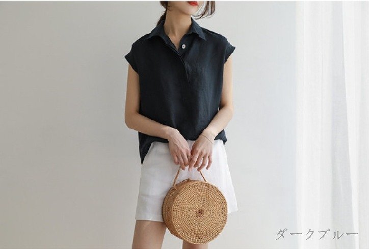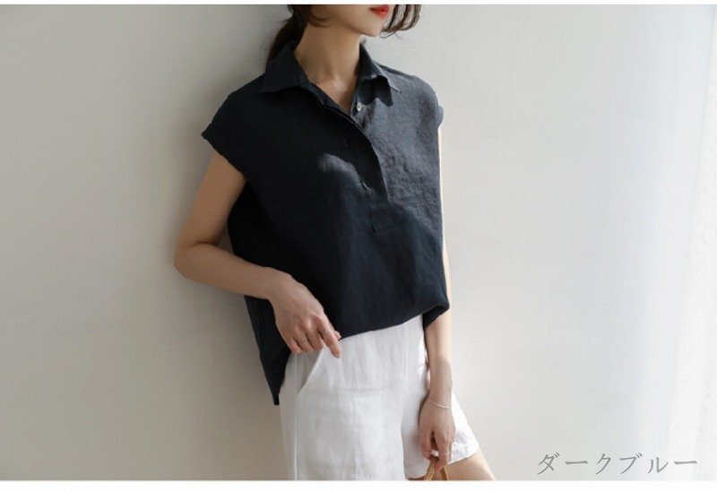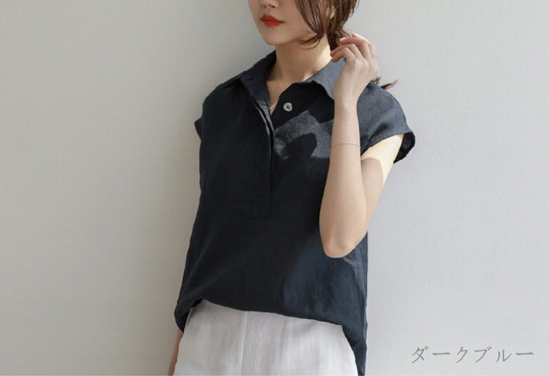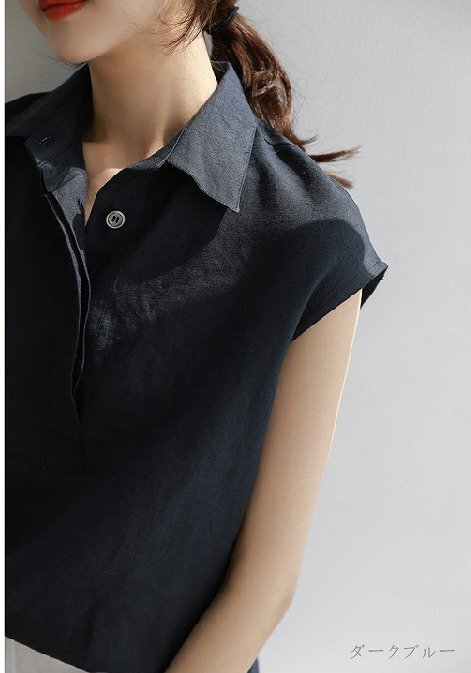 トップス シャツ ブラウス フレンチスリーブ ミニ袖 シンプル オフィスカジュアル 仕事 通勤 OL L ダークブルー 收藏