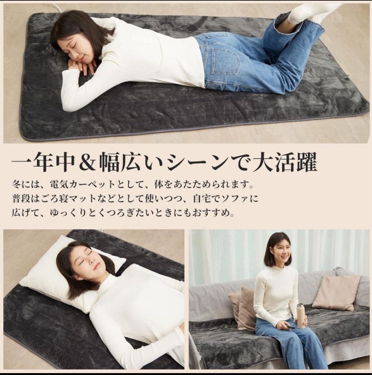 【一年中&幅広いシーンで大活躍】お一人様に合うサイズ:180*80cm、「電気カーペット」と「電気敷毛布」として両用できるタイプです。冬には、体が冷えて眠れない方は就寝前に寝床でこれを使って、体をあたためられます。普段はごろ寝マットなどとして使いつつ、自宅でソファに広げて、ゆっくりとくつろぎたいときにもおすすめ。テレビを見たり、読書をしたりするときなど、ちょっとしたときに使えます。収納ベルトが付いておりますので、オフシーズンのときの収納も1枚分で済み、省スペースで収まります。