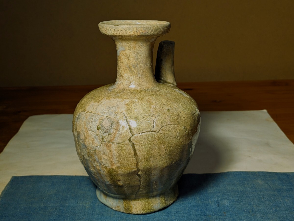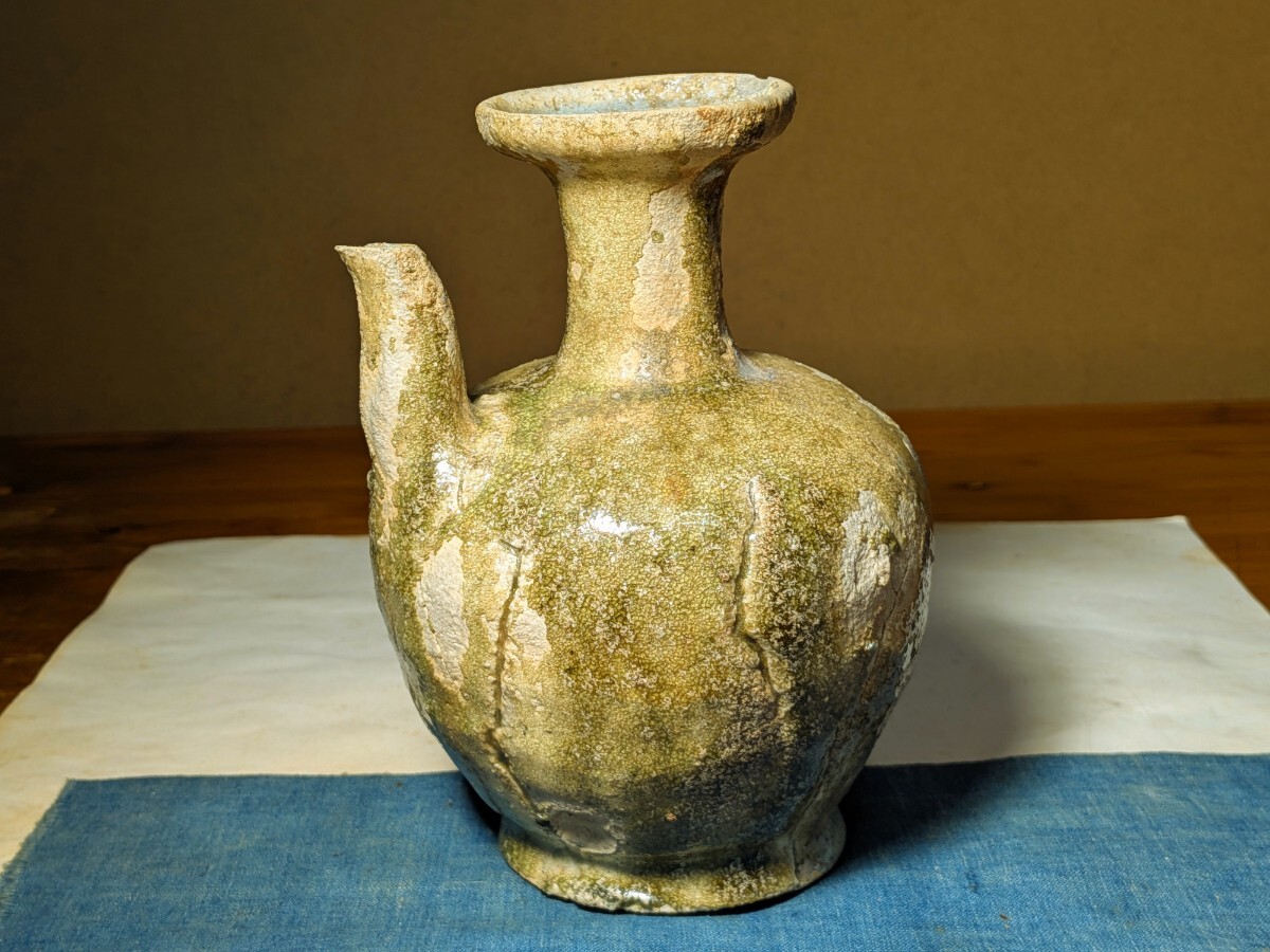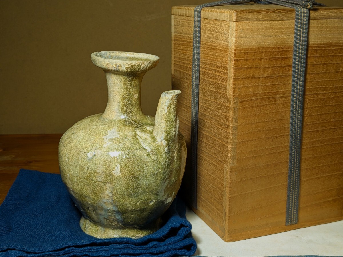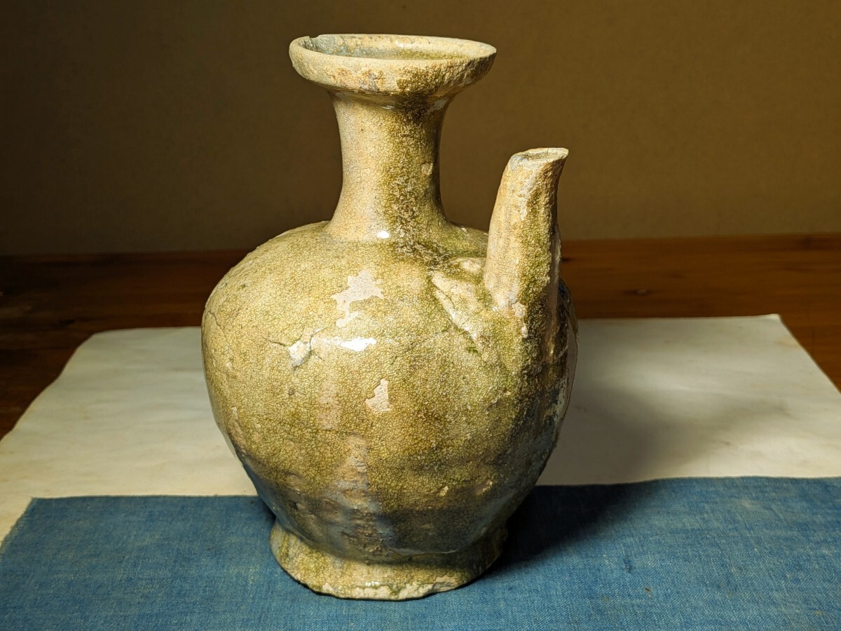 古瀬戸の水注です。発掘品ですが修理箇所がなく、8割以上美しい釉薬が残っています。窯傷が数か所ありますがすべて釉薬で埋まっています。水を張って3時間程様子を見ましたが水漏れはありませんでした。数人の酒宴にも良いかと思います。古瀬戸の魅力を凝縮した古瀬戸水注を特別出品です。箱あり。・胴径12.5センチ・高さ17.3センチ・鎌倉時代 ※新規の方、評価の悪い方の入札は取り消す場合があります。商品到着後は速やかに取引ナビの受取連絡を入れて下さい。