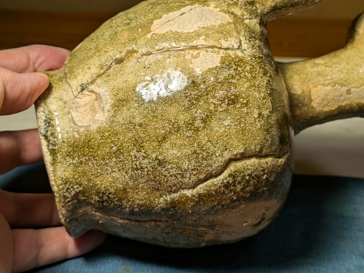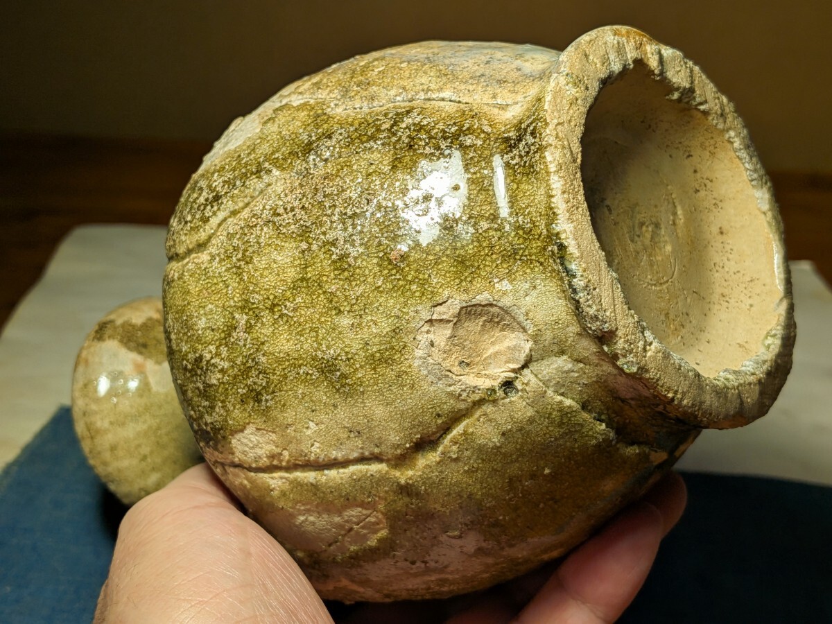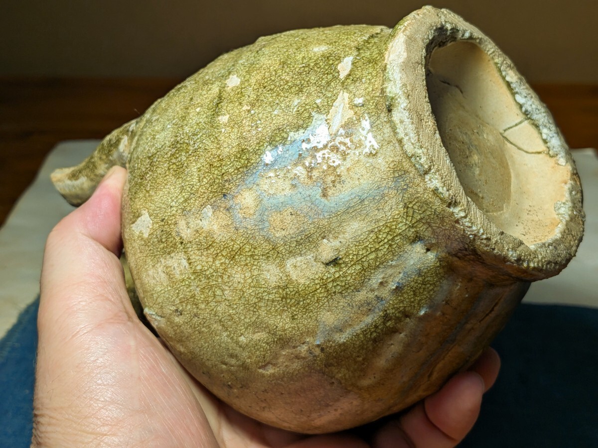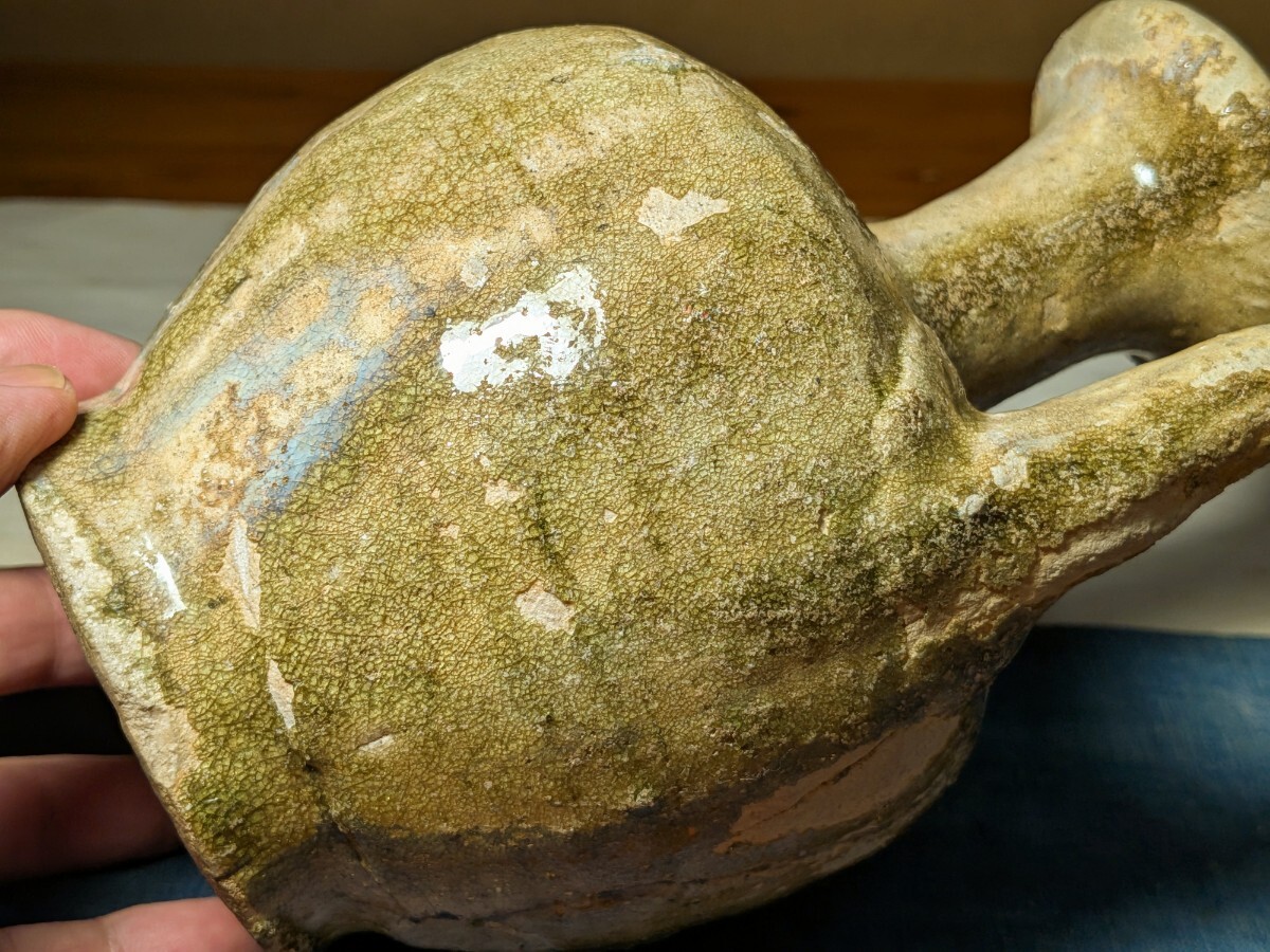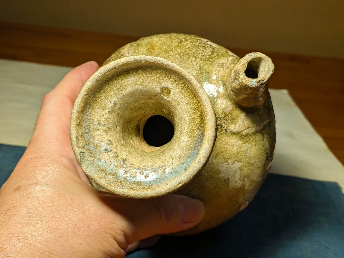 古瀬戸の水注です。発掘品ですが修理箇所がなく、8割以上美しい釉薬が残っています。窯傷が数か所ありますがすべて釉薬で埋まっています。水を張って3時間程様子を見ましたが水漏れはありませんでした。数人の酒宴にも良いかと思います。古瀬戸の魅力を凝縮した古瀬戸水注を特別出品です。箱あり。・胴径12.5センチ・高さ17.3センチ・鎌倉時代 ※新規の方、評価の悪い方の入札は取り消す場合があります。商品到着後は速やかに取引ナビの受取連絡を入れて下さい。