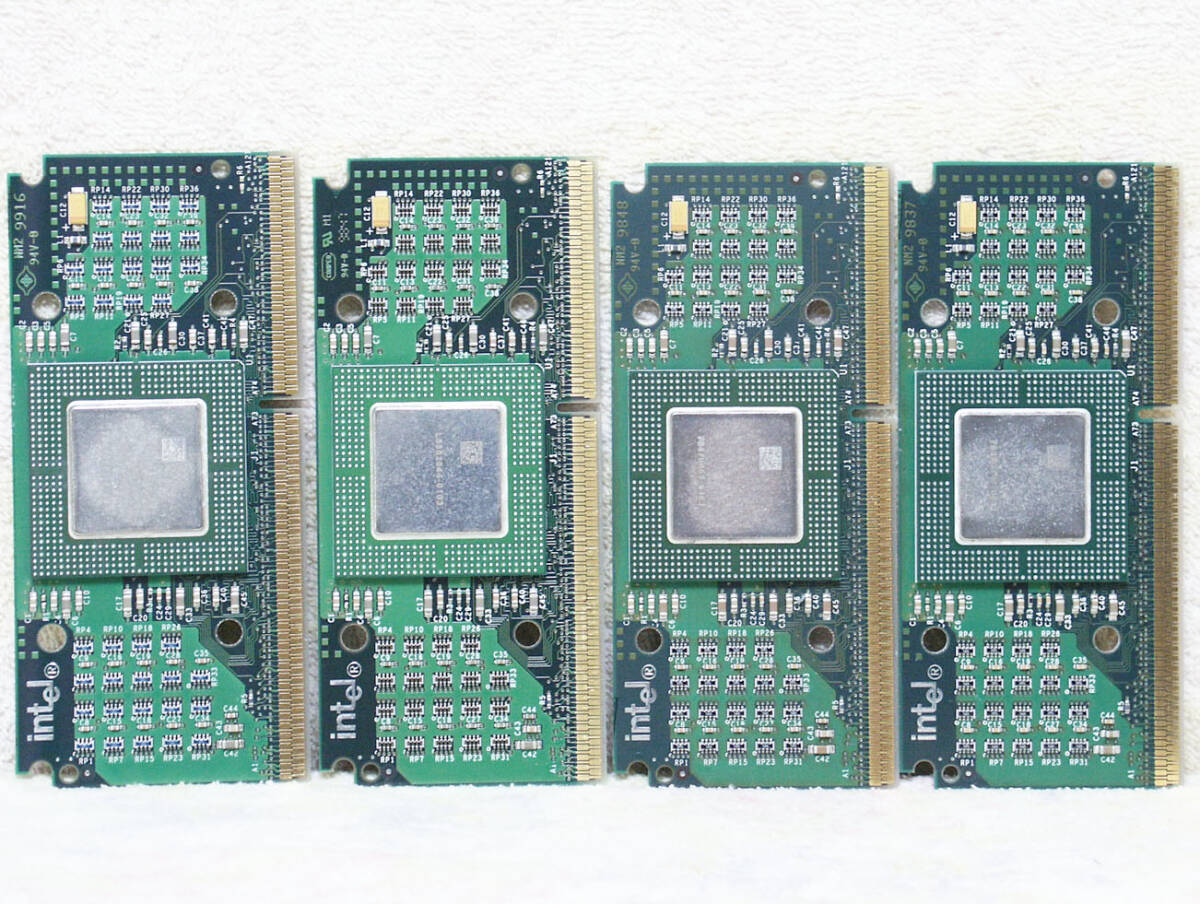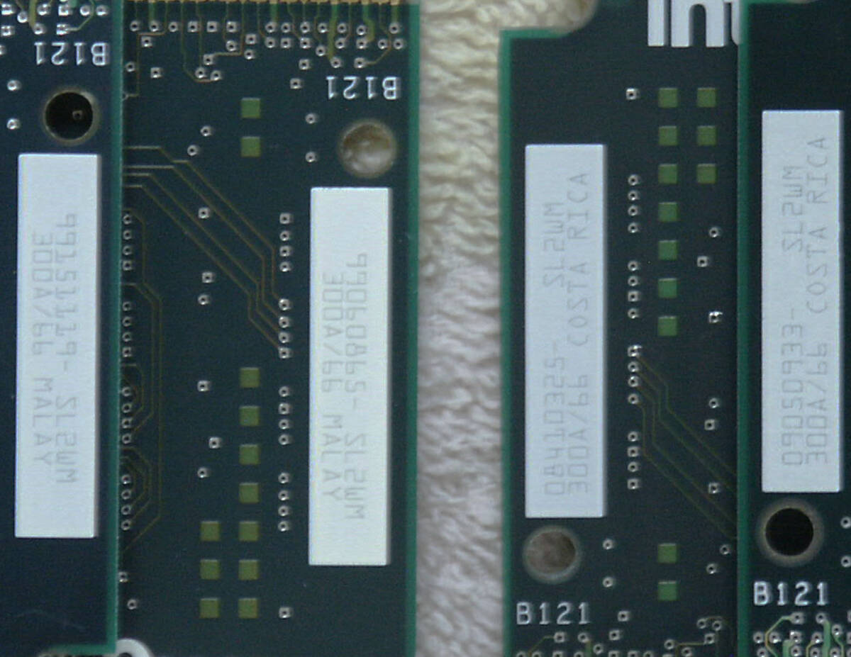 こちらは、INTEL製のSLOT1向けCPU、Celeron300Aの4個セットです。いずれも動作確認済です。氷河期世代の方にとっては青春の思い出とも言える1品です。SL2WMのコスタリカ産が2個、マレーシア産が2個です。倍率が4.5倍固定であることを逆手にとって、ベースクロックを66MHzzから100MHzに上げることで450MHzで動作させることが当時流行しました。今となってはそのようなマニアックな環境も残っていませんので、定格の動作確認しかしていませんが、SLOT1のメインボードの動作確認用としても重宝すると思われますので、是非ご活用下さい。 | |||||||||||||||||||||||||||