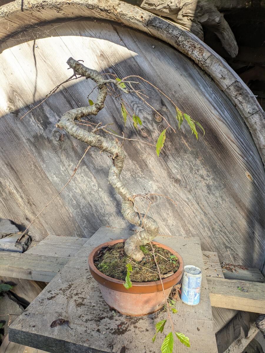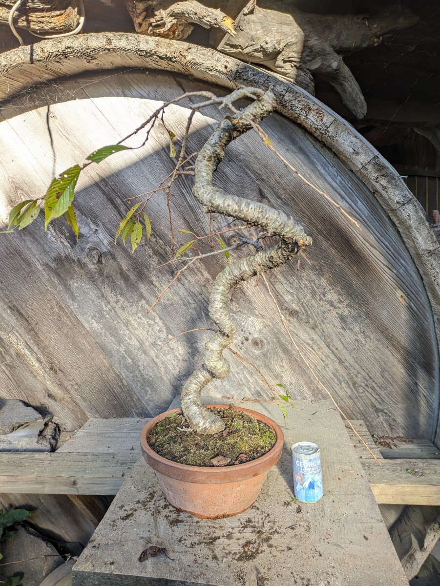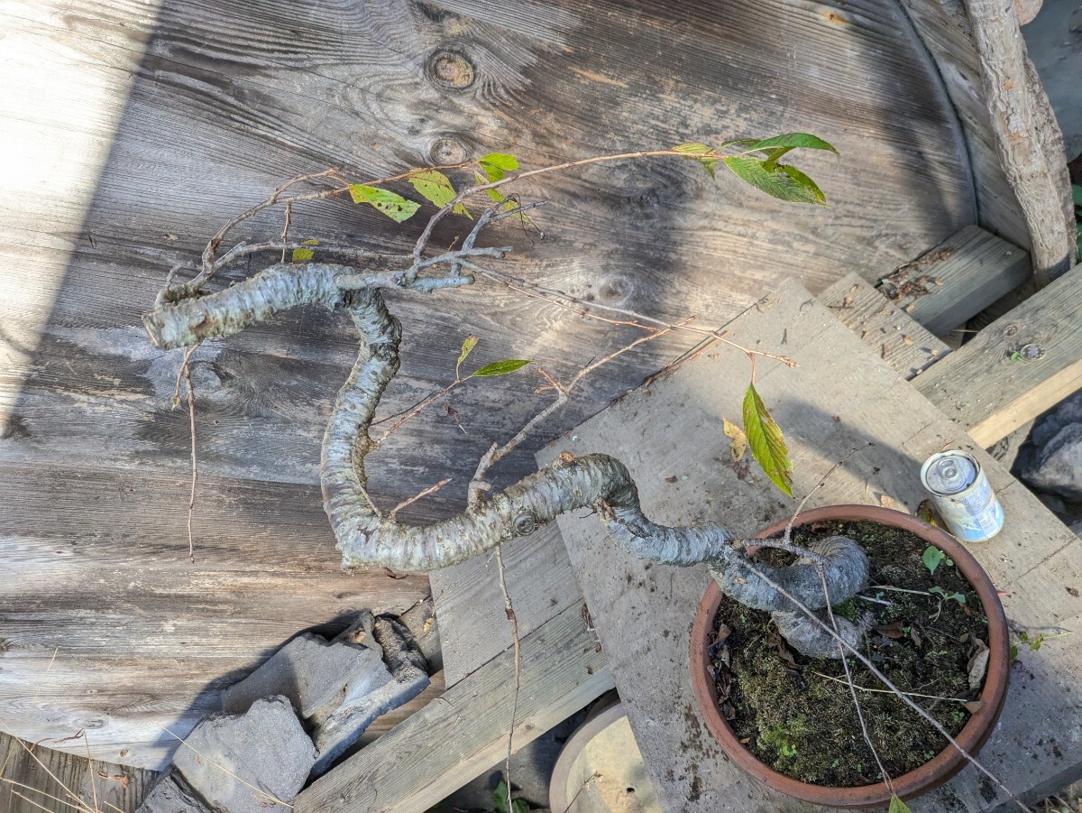 およそは50x50x70cmの枠に入るサイズ。根本付近からの高さは58cmくらい。頭付近の主幹を切って背を低く作り直した鉢作りの長い木です。鉢は老朽化してます。発送梱包の際に痛むヶ所が有るかもしれません。佐川急便にて発送する事も有ります。