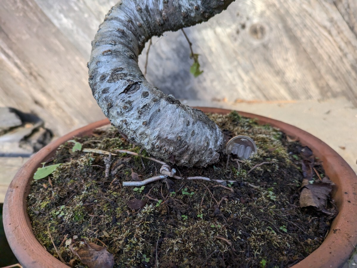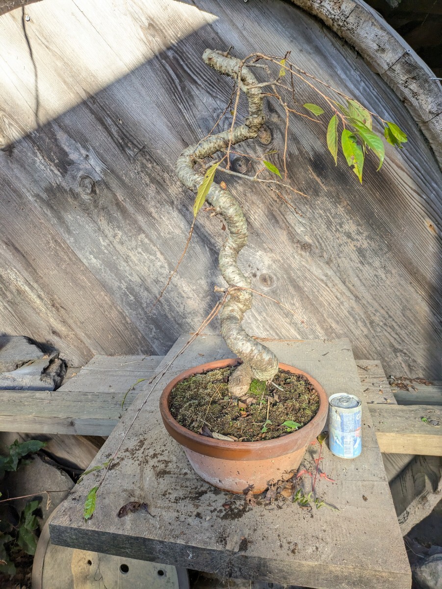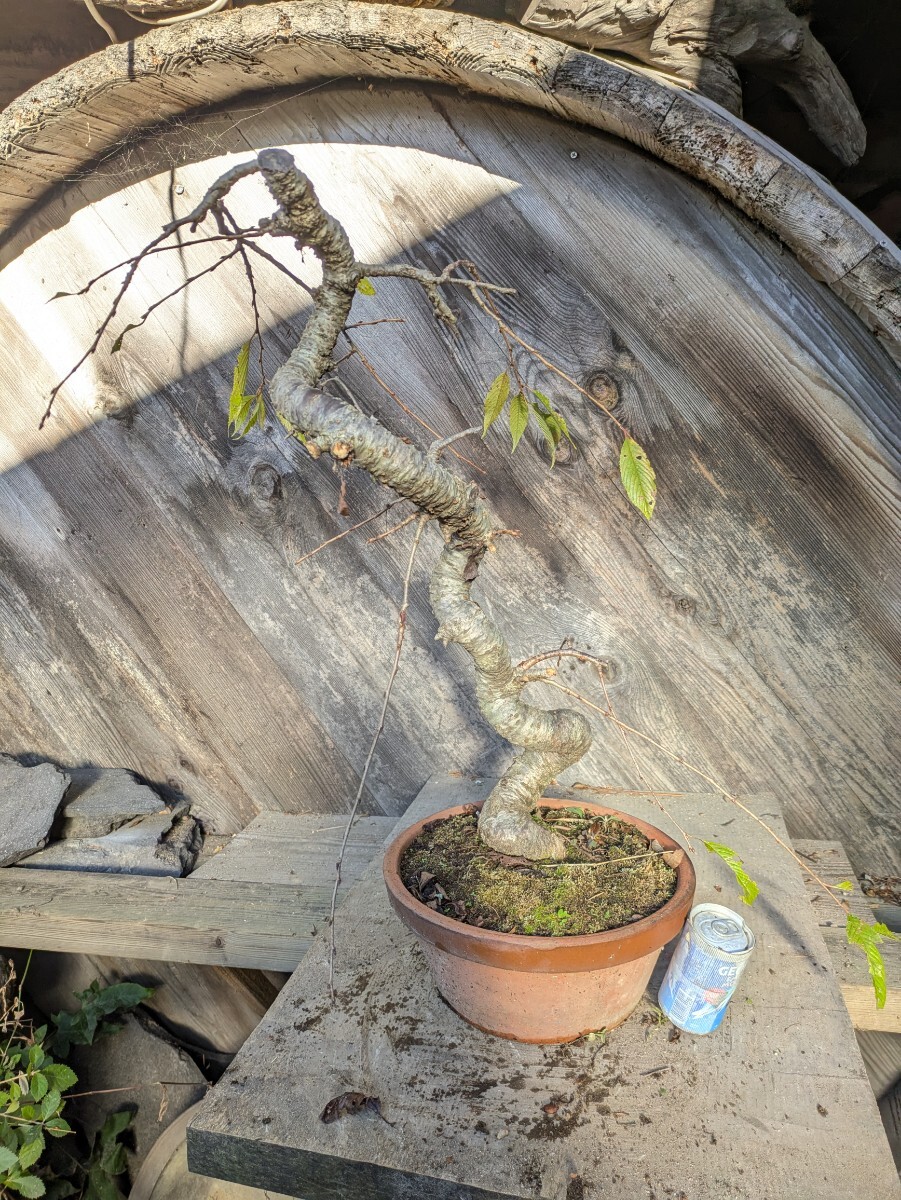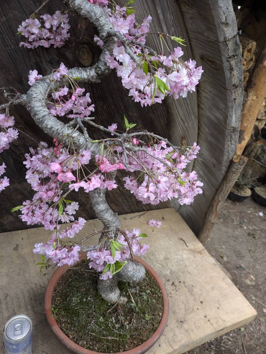 およそは50x50x70cmの枠に入るサイズ。根本付近からの高さは58cmくらい。頭付近の主幹を切って背を低く作り直した鉢作りの長い木です。鉢は老朽化してます。発送梱包の際に痛むヶ所が有るかもしれません。佐川急便にて発送する事も有ります。