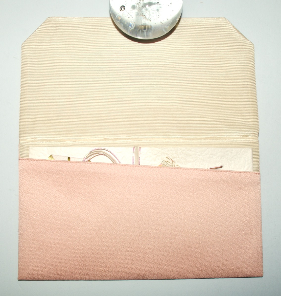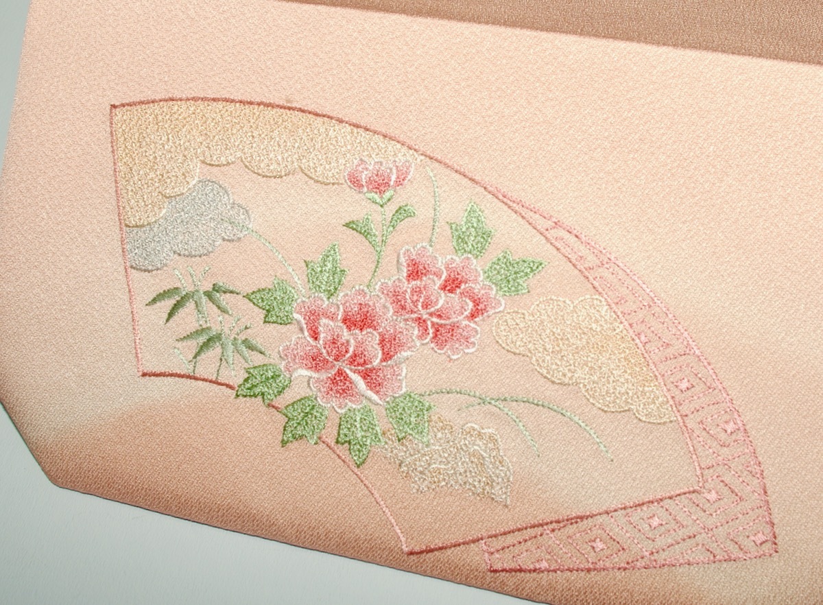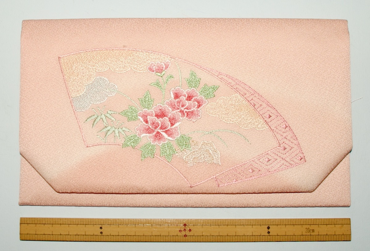 [佳]114)正絹金封ふくさ 袱紗 サーモンピンクに刺繍の牡丹の扇面 懐紙入 経本入 ハンドメイド 手作り 着物リメイク 收藏