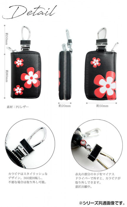 キュートな花柄のキーケースが登場!エンボス加工で、見た目と手触りにこだわりぬいたデザインです。スタイリッシュなデザインのカラビナは、不要な場合は取り外し可能です。落下防止のため、ケース内にチェーンがついていて安心です。さらに、3面ジッパーでしっかりと保護します。箱入りで、プレゼントにも最適です。