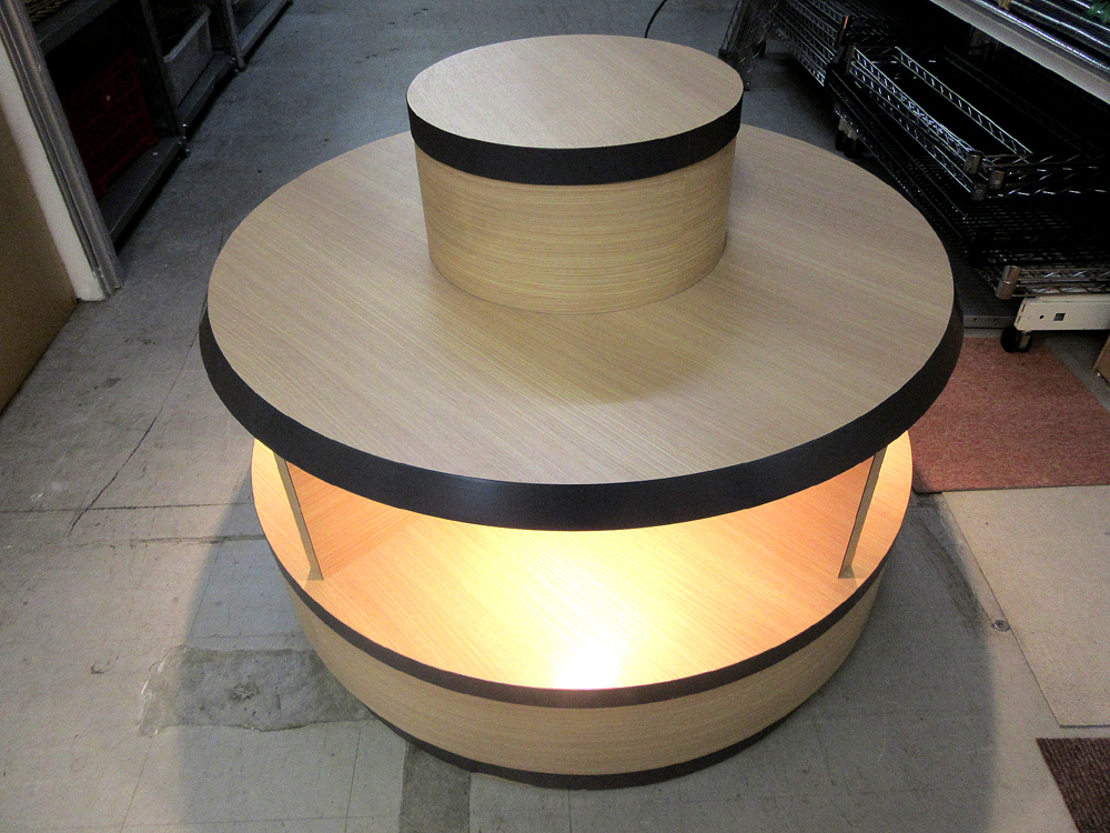 中段に照明付き 店舗什器 島什器 二段 アイランド什器 直径 100cm 店舗用品 商品棚 キャスター付き 中古 札幌市厚別区 厚別店