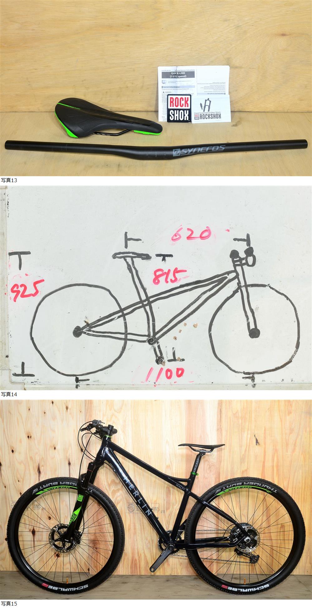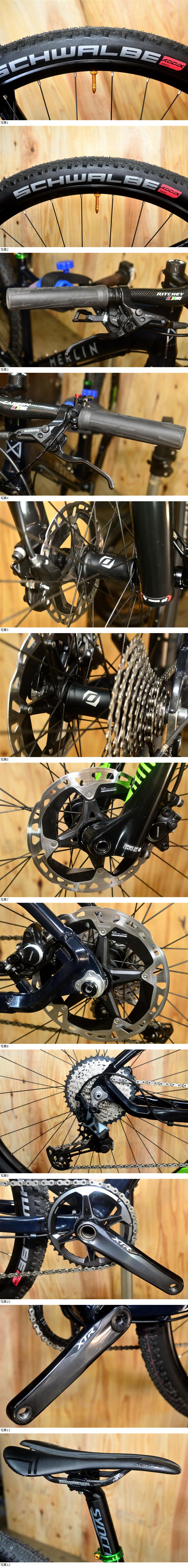 当方、自転車組立等の知識と経験はそれなりにはありますが、所詮は素人ですのでその事をご理解及びご考慮していただきますよう、ご不安がある様でしたらお近くのプロショップにて整備されてからご使用願います。 2023年10月に新たに1台組み上げしたのと同時に、手持ちの車体でパーツ類のグレードアップ1台をした方の車体で、出来るだけ細かく説明させていただきますので、画像を含め長文にはなりますが興味が御座いましたら是非最後までお付き合いお願い申し上げます。 フレームは2021年3月に中古を購入致し、その後何度か組み替えを行っており下り系レースにも数回出場致し、現在は街乗り仕様でロングライドや下りを攻める場合、付属のパーツに交換いただければ宜しかと思います。 現在タイヤの消耗度は、2026年1月19日時点で約8分山程度で、状況はその都度更新いたします。 説明画像3番目、サドルの縁にすり痕が見られます。 説明画像4番目、シフター取付の際輪っかが破損し、やらかしましたのでインシュロックにて代用し取り付けてます。 説明画像5番目27.5+ (650b)のフレームですが29インチのタイヤも装着可能で、2.25 (約57mm) が限界です。 目立つ傷はありませんが、小さな傷やすり痕をタッチアップした痕が見られます。 説明画像最後から2番目、サイズ的はこんな感じで当方身長167cm股下76cm正式なフィッティング計測はしてませんが、Mサイズなので自身には少し大きく感じまして、ご参考にして下さい。 各部品及びパーツ詳細 完成車重量:11.63kg フレーム ・ー・ー・ー・ー・ー・ー・ MERLIN MALT+ 27.5+ (650b) alloy BOOST12 x 148mm (2018) Fフォーク ・ー・ー・ー・ー・ー・ー・ Rock Shox Judy Gold 15x110mm 29 travel 100mm (2017~2019) Fフォーク リモートレバ ー ・ー・ー・ー・ MicroHero ヘッドセット ・ー・ー・ー・ー・ー・ FSA 1-1/8 to 1-1/2 ブレーキレバー ・ー・ー・ー・ー・ー・ シマノ BL-M315 ブレーキキャリパー ・ー・ー・ー・ー・ シマノ BR-M315 ディスクローター ・ー・ー・ー・ー・ シマノ XTR RT-MT900 F-180mm R-160mm ボトムブラケット ・ー・ー・ー・ー・ シマノ XTR SM-BB93 68/73mm クランク ・ー・ー・ー・ー・ー・ー・ シマノ XTR FC-MT9120 38t 170mm スプロケット ・ー・ー・ー・ー・ー・ シマノ CS-M7000 11-42 11S SLX シフター ・ー・ー・ー・ー・ー・ー・ シマノ SL-M7100 (I-Spec EV) 12S リアディレイダ ー・ー・ー・ー・ー・ シマノ SHIMANO SLX RD-M7100-SGS ハンドル ・ー・ー・ー・ー・ー・ー・ RITCHEY WCS carbon 590mm ステム ・ー・ー・ー・ー・ー・ー・ー・ Syncros 80mm Alloy 5° サドル ・ー・ー・ー・ー・ー・ー・ー・ SELLE SANMARCO ASPIDE SUPERLEGGERAl シートポスト ・ー・ーー・ー・ー・ー・ Syncros 31.6mm 400mm Alloy (100mmカット) ポストクランプ ・ー・ー・ー・ー・ー・ KCNC alloy 34.9mm リム ・ー・ー・ー・ーー・ー・ー・ー・ Syncros X-25 32H Fハブ ・ー・ー・ー・ー・ー・ー・ー・ Formula CL811 15x110mm Rハブ ・ー・ー・ー・ー・ー・ー・ー・ Formula CL1248 Boost 12x148mm スポーク ・ー・ー・ー・ー・ー・ー・ Stainless Black 15G 1.8mm タイヤ ・ー・ー・ー・ー・ー・ー・ー・ Schwalbe Thunder Burt Evo Super Ground 29" 2.1" シーラント ・ー・ー・ー・ー・ー・ー・ Stan’s NoTubes QUART 50cc 前後 チューブレステープ ・ー・ー・ー・ー・ ノーブランド 25mm 前後 チェーン ・ー・ー・ー・ー・ー・ー・ー・シマノ XTR CN-M9100 ハンドルグリップ ・ー・ー・ー・ー・ー・Syncros 付属品 (予備部品・パーツ等) サドル ・ー・ー・ー・ー・ー・ー・ー・ Syncros XR2.5 ハンドル ・ー・ー・ー・ー・ー・ー・ Syncros 6061 720mm Alloy 9° 各部品・パーツ取説(シマノの取説が一部欠損しております) | ||||