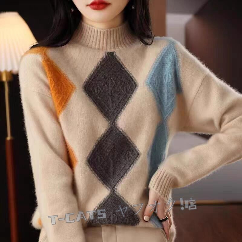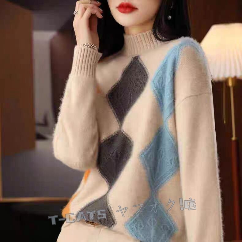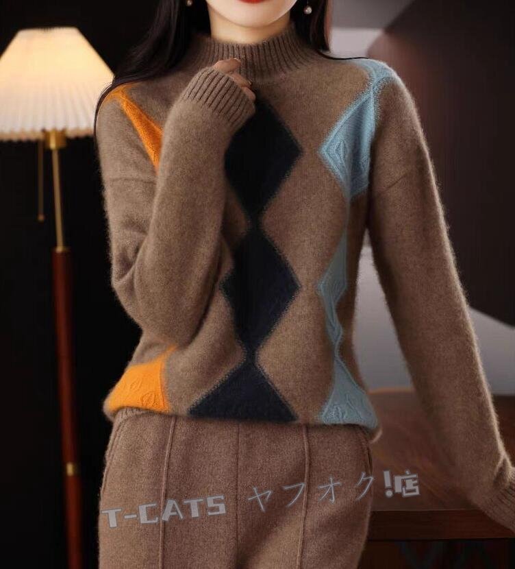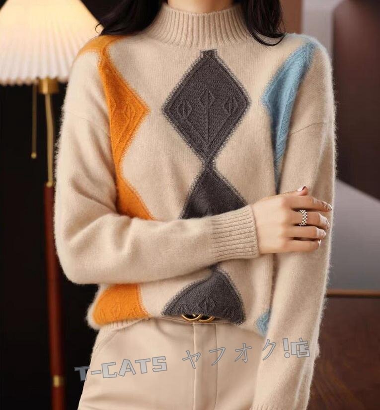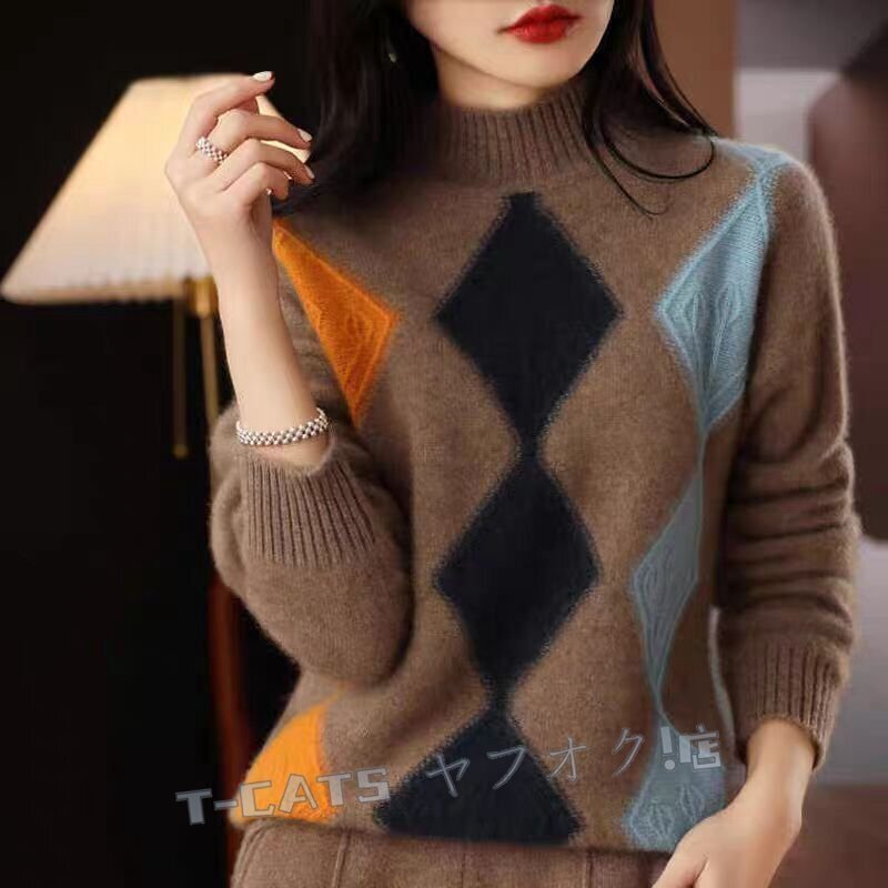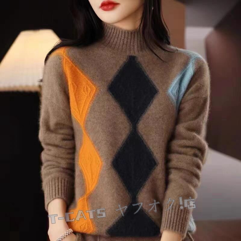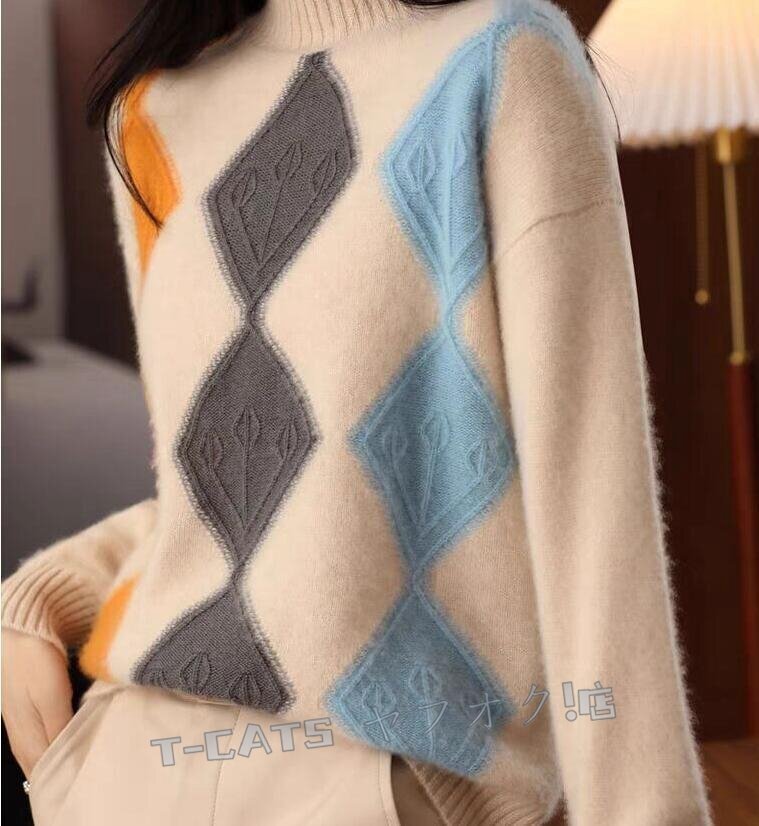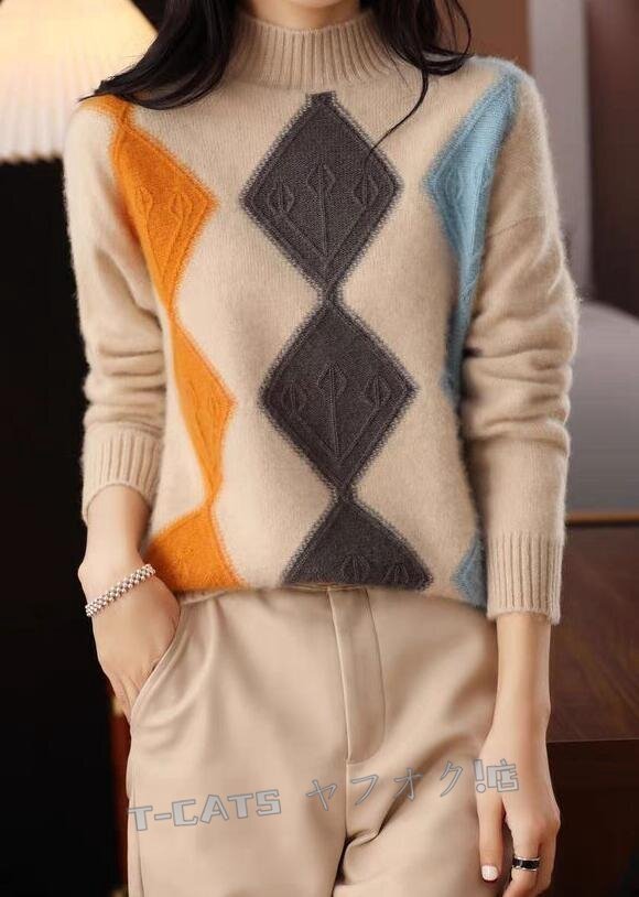 ☆新品秋冬 上質 ミンクカシミヤ混 配色柄 ニットトップス ゆったり 気質良い おしゃれ 大人 ニットセーター キャメル 收藏