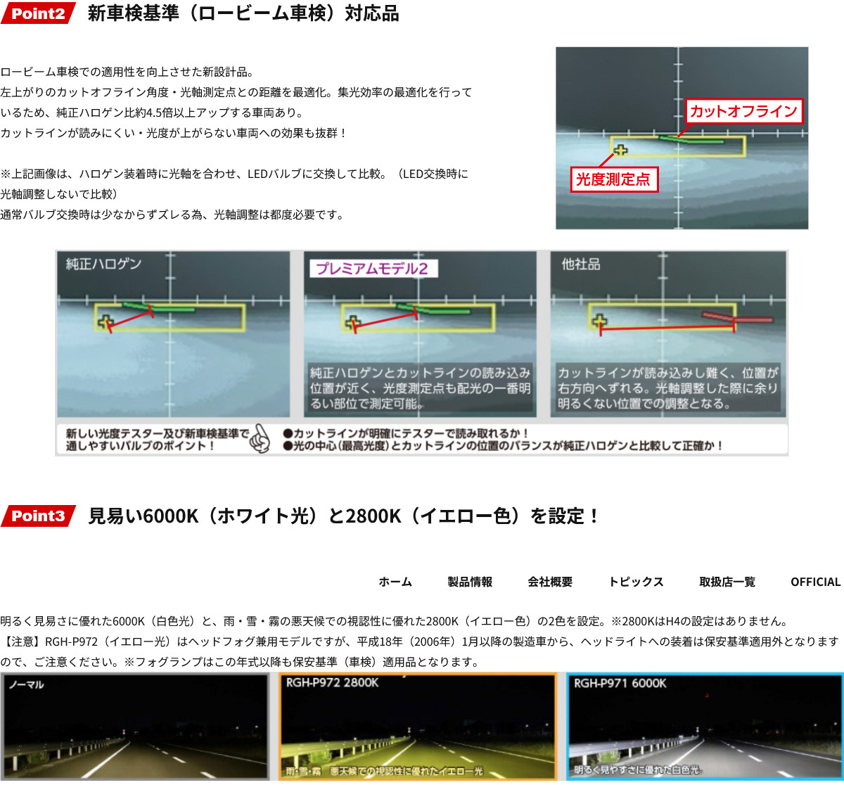 | ■商品説明 | 本当の見やすさを追求した照射性能 手前から奥までワイドで明るい!プレミアムモデル2 ハロゲンバルブと同形状で簡単にLEDへアップグレード! 業界最高レベルの明るさを実現! 商用車にも使える超タフ・高耐久設計! *車検対応 *ヘッド・フォグ兼用 *3年間保証 *色温度6000K(P971/P973) *色温度2800K(P972) *ハロゲン同形状 *ドライバー内蔵 *内蔵ファン+銅製基板・ヒートパイプ *高い光束維持率 *明るさシングル6000ルーメン *明るさH4 Hi5800/Lo5000ルーメン *ハイビームインジケータキャンセラー内蔵(H4) *シングル H11タイプ/HB/HIR2兼用フランジ同梱 ◎最高レベルの明るさ6000ルーメン ※シングルバルブ2ヶの値 H4はHi:5800lm/5000lm ※バルブ2ヶの値 ワイドLEDチップ採用で、ノーマルバルブで照射しない範囲を明るくカバー。 ドライバーが運転中に本当に見たい手前・左右・中央の照度を格段に向上させました。 ◎新車検基準(ロービーム車検)対応品 ロービーム車検での適用性を向上させた新設計品。 左上がりのカットオフライン角度・光軸測定点との距離を最適化。集光効率の最適化を行っているため、純正ハロゲン比約4.5倍以上アップする車両あり。 カットラインが読みにくい・光度が上がらない車両への効果も抜群! |