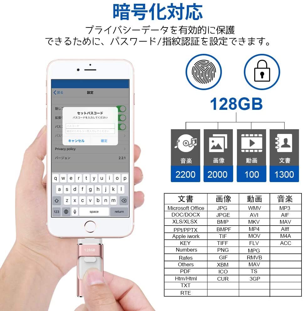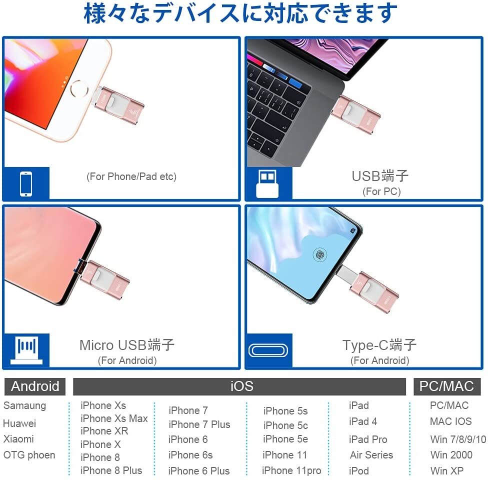 「優れた互換性&兼用性usbメモリー フラッシュドライブ 」ほとんどのスマホ デバイスと互換性があります。Phone 12pro、Phone 12、Phone XS MAX、 Phone X、Phone 8、Phone 7 Plus / Phone 7 / Phone 6s Plus / Phone 6s / Phone 6s / Phone 6 plus / Phone 5s / Phone 5c /Phone 5 / Phone 4 / iPad Pro / iPad 4 / iPad Air / iPad miniシリーズ/ iPod touch 5 / Macbook Pro(iPad ProやMacebookのType-cに対応出来ます)