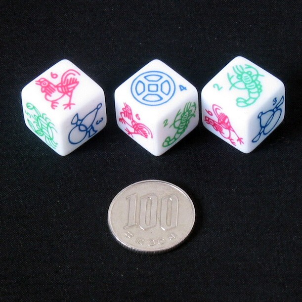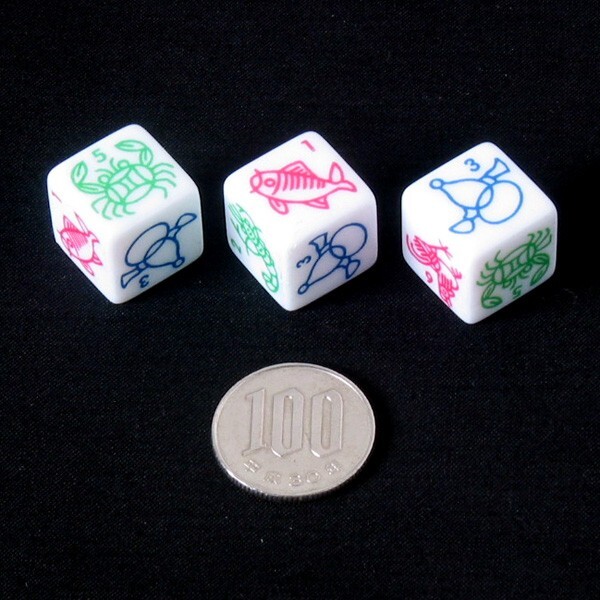 「魚蝦蟹」は、中国南部から東南アジア全域にかけて遊ばれている伝統的なサイコロです。「マカオダイス」「坊慶高」などとも呼ばれており、骰子の面 にそれぞれ蝦・蟹・魚・鶏・瓢箪・貨幣が描かれており、子は同じ絵の描かれた台紙に賭けて親と勝負します。国や地域により若干絵柄が異なりますが、「魚・蝦・蟹」が描かれていることは殆ど共通しています。マカオのカジノでは特に中国人に人気のあるギャンブルとして知られています。以前から欲しかったのですが、どこにも売ってないので作りました。●白いサイコロにシールで絵柄を貼って、ニスで定着してあります。彫り込みではないので長い時間使えば擦れてくることもあると思います。●大きさは1辺約16ミリ、重さは約3グラム。●実際のゲームでは3個を1セットとして使います。3個で送料込み780円です。