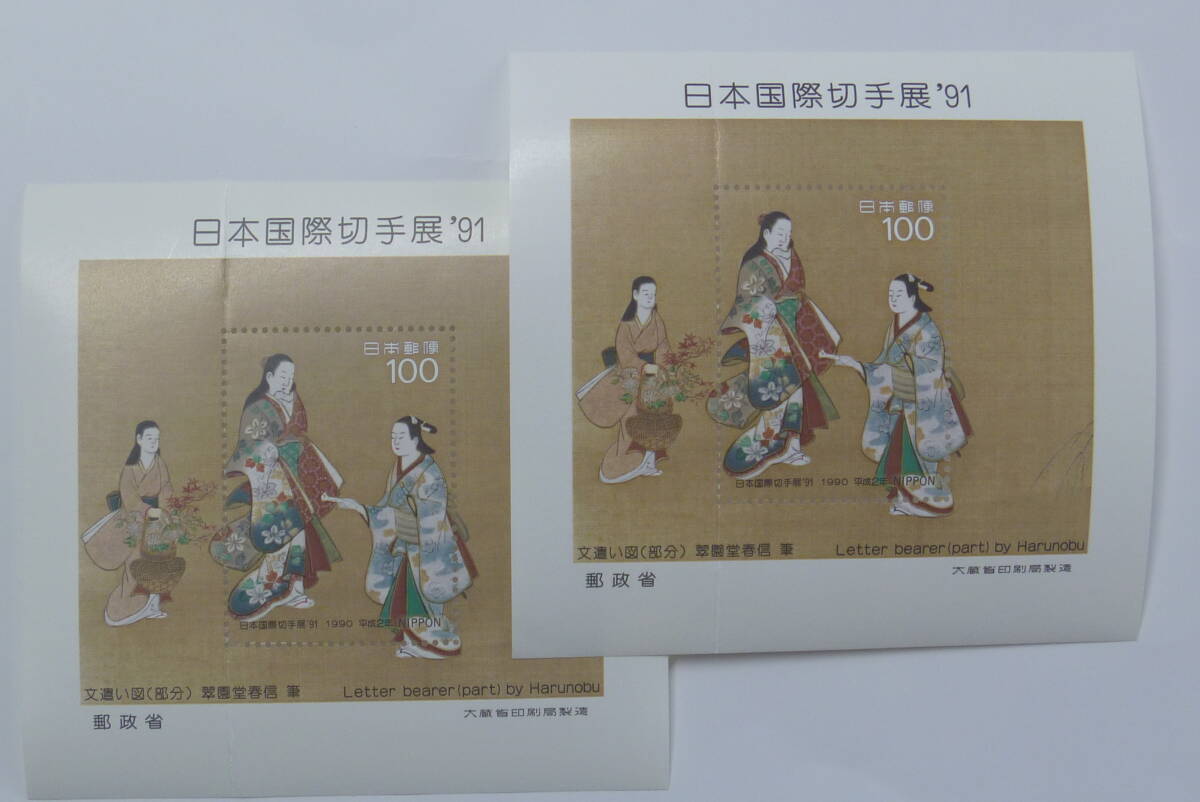 【日本国際切手展’91】100円記念切手シート×2枚組★未使用★送料〒85円(郵便書簡)2つ折りで発送★文遣い図(部分)翠園堂春信 筆★1863◆ 收藏