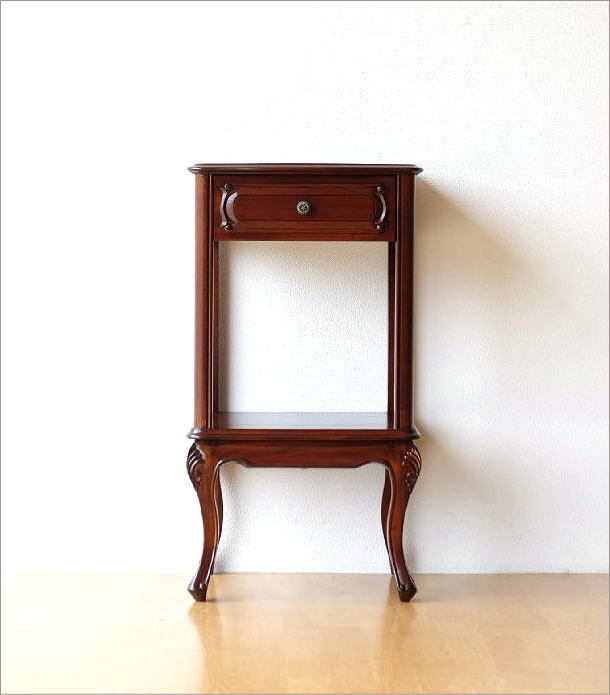 | インドネシアの高級材料マホガニー材で作られた クラシックで上品な雰囲気の ヨーロピアンデザインのインテリア 花台や電話台などに最適な ちょっぴりワイドなサイズの オールマホガニー無垢材のコンソールは 下棚とアンティークな花模様の取っ手が付いた 引き出し付きです 高級感のある猫脚や引き出し等に施された 職人による繊細な手彫りの文様が 重厚感のある佇まいを一層引き立ててます 一緒に置いたり飾ったりする花瓶や小物を いっそう上品な印象を与えそうなコンソールは リビングや玄関にお薦めのインテリアです 商品名 : マホガニーコンソール二段花台 商品番号 : wat7346 全体のサイズ(cm) : 幅43×奥行37×高さ80 天板 : 幅43×奥行37 引き出し内寸 : 幅30×奥行27×深さ7 棚 : 幅41×奥行34 棚空間高さ : 34 床からの空間高さ : 25 材質 : オールマホガニー無垢材(ラッカー塗装) 重量 : 約8kg 生産国 : インドネシア ※床のキズ防止フェルトを貼ってお届けします ※木目や節・色合いの違い、表面の小さな傷等は、木の表情としてご了承ください |