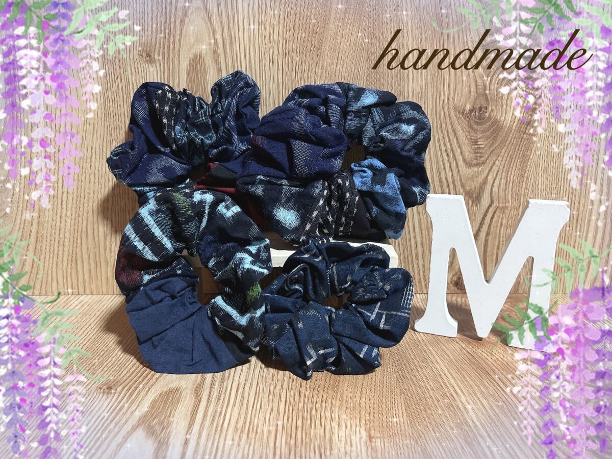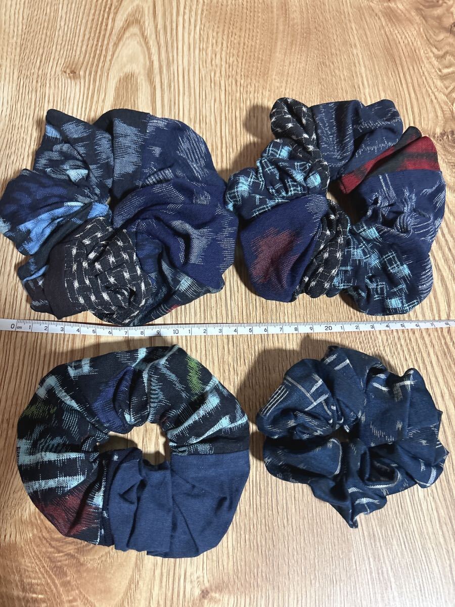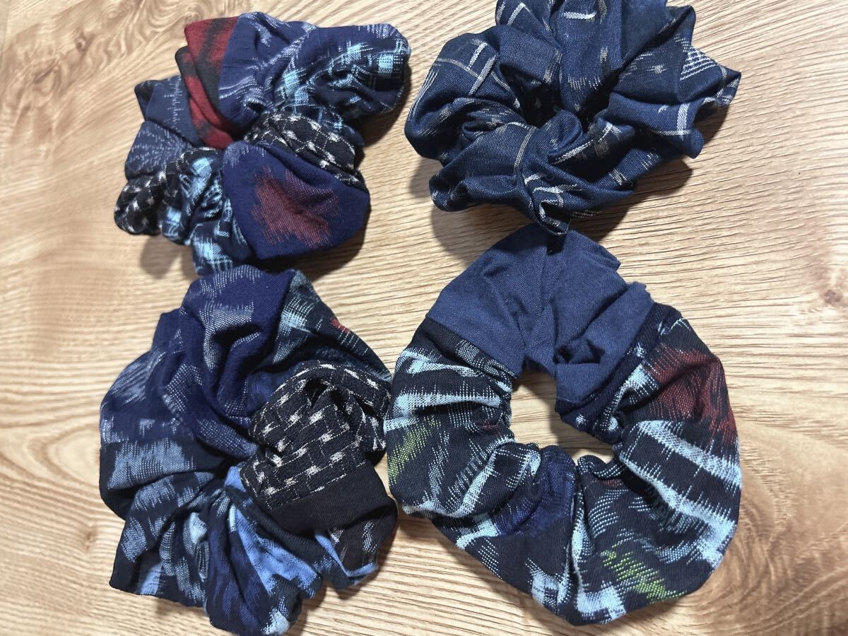 66☆ハンドメイド☆絣シュシュ4つセット☆和柄ヘアゴム☆パッチワーク☆古布リメイク☆藍染☆久留米絣☆備後絣☆絵絣☆結城紬 收藏