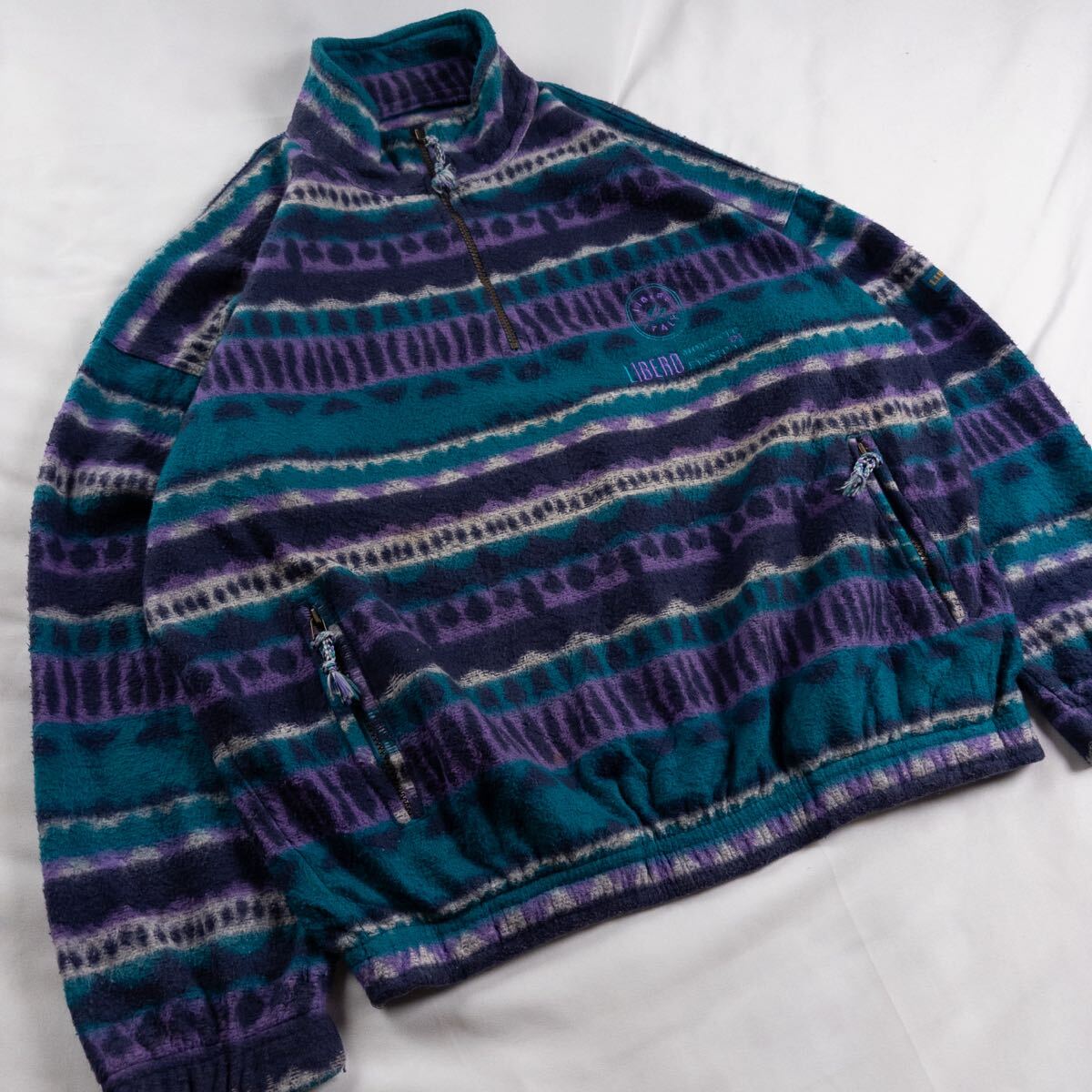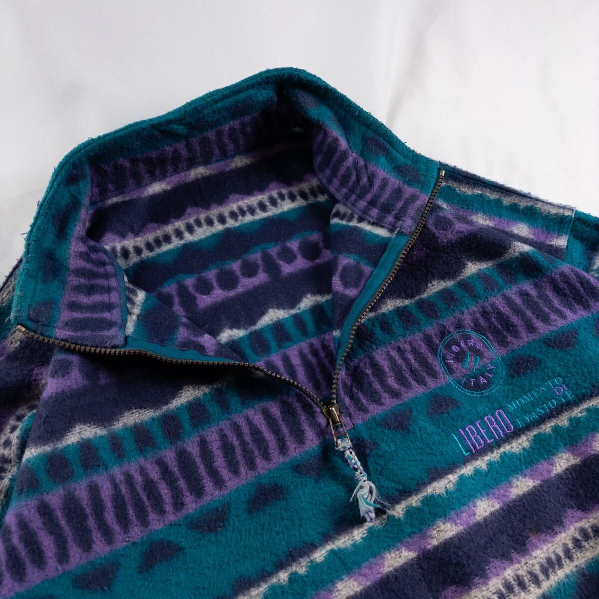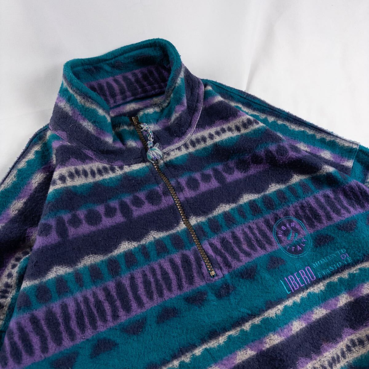 Euro Vintage ユーロ製 90s LIBERO ハーフジップ 刺繍 ロゴ エスニック 民族 アート クレイジーパターン ボーダー 総柄 フリースジャケット 收藏