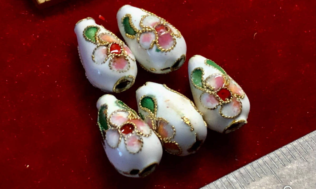 ¶!¶ 有線七宝焼ワールド - 5個水滴型玉で1単位 ¶!¶ 約3㎜×7㎜×13㎜玉 金線に白釉ピンク花 手作り 手芸 工芸 インテリア 趣味 收藏