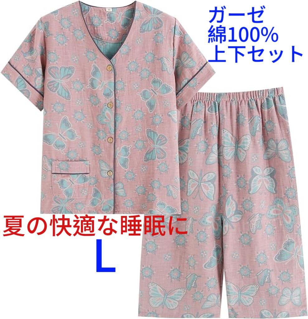 #パジャマLレディース上下セット夏半袖ダブルガーゼ五分丈パンツ綿100%先染め