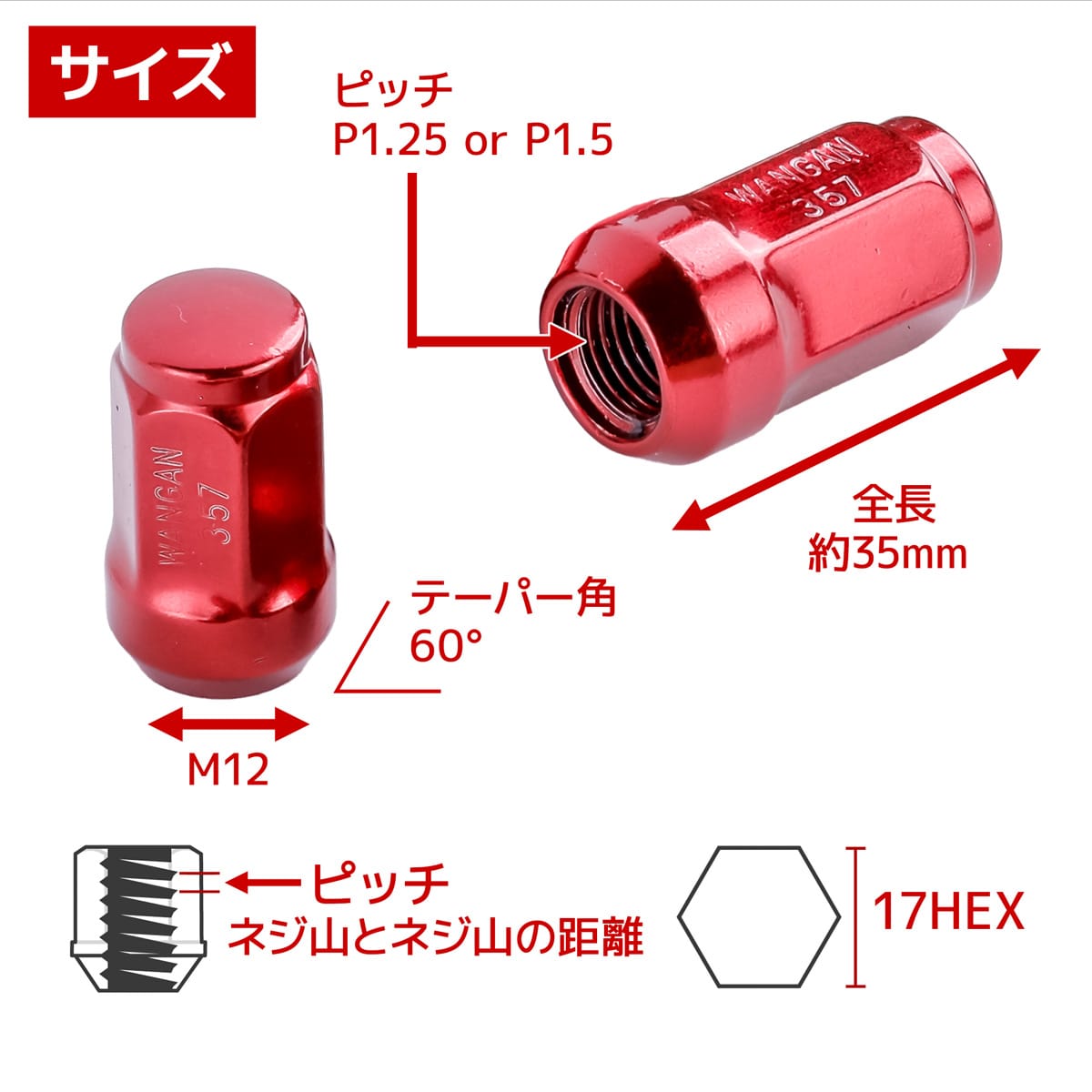 WANGAN357 ホイールナット 袋タイプ 赤 レッド スチール 17HEX M12×1.25 テーパー60° 35mm 16個入り 4穴 日産 スバル スズキ 收藏