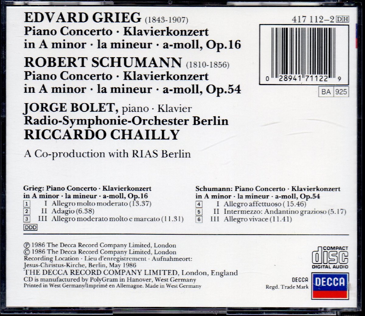 グリーグ,シューマン:ピアノ協奏曲 ボレット(p) シャイー=RSOB (DECCA*417112) 收藏