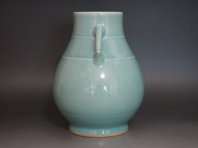 B1950 平安 洛山 造 青瓷 耳付 花瓶 ☆ 華道具 花道具 茶道具 花器 花入 花生 花活 飾壺 飾壷 青磁 陶器 作家物 在銘 陶印 窯印 良品 無傷 收藏