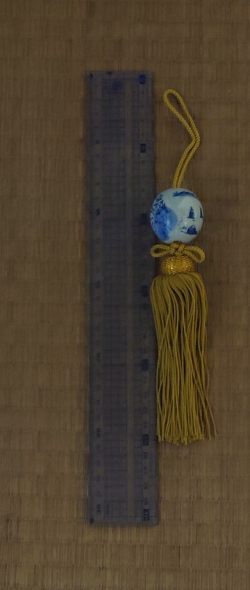 青白磁の染付風景文様が描かれた、上品な陶磁製の房飾り(ふさかざり)です。