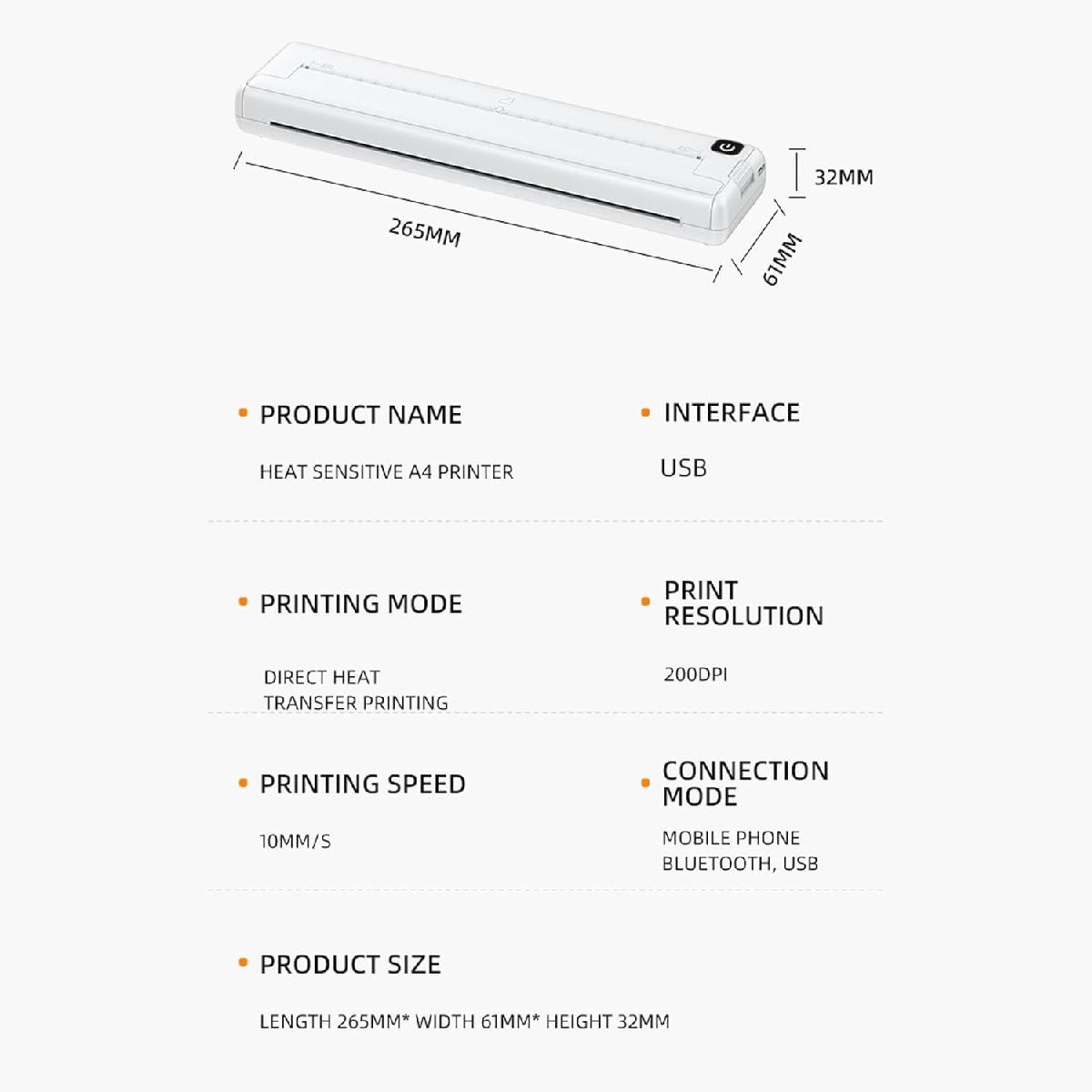 ミニポータブルA4サーマルプリンター インクレス HD印刷 USB充電式 旅行用 家庭用およびオフィス用のポータブルプリンター ホワイト 收藏