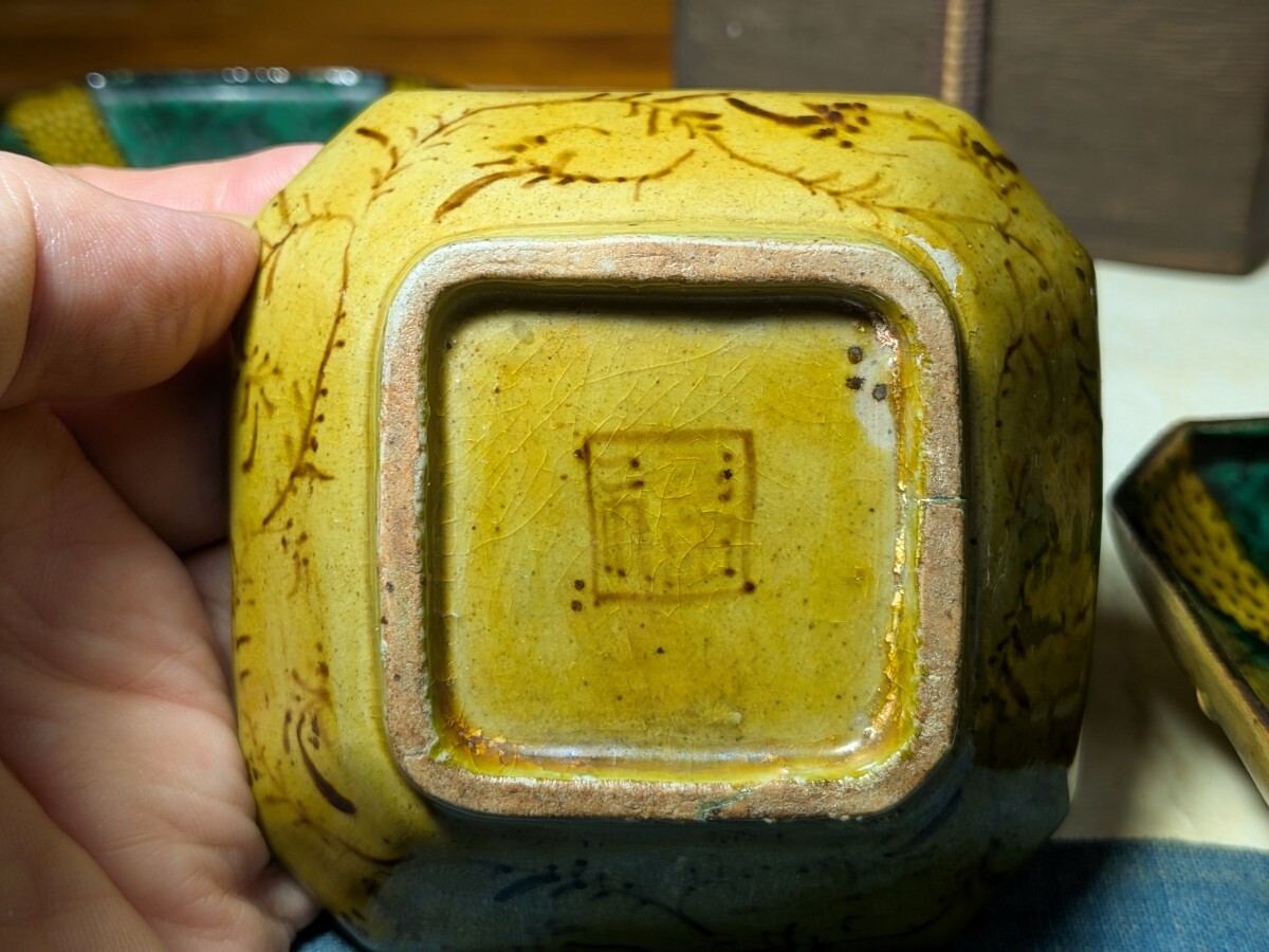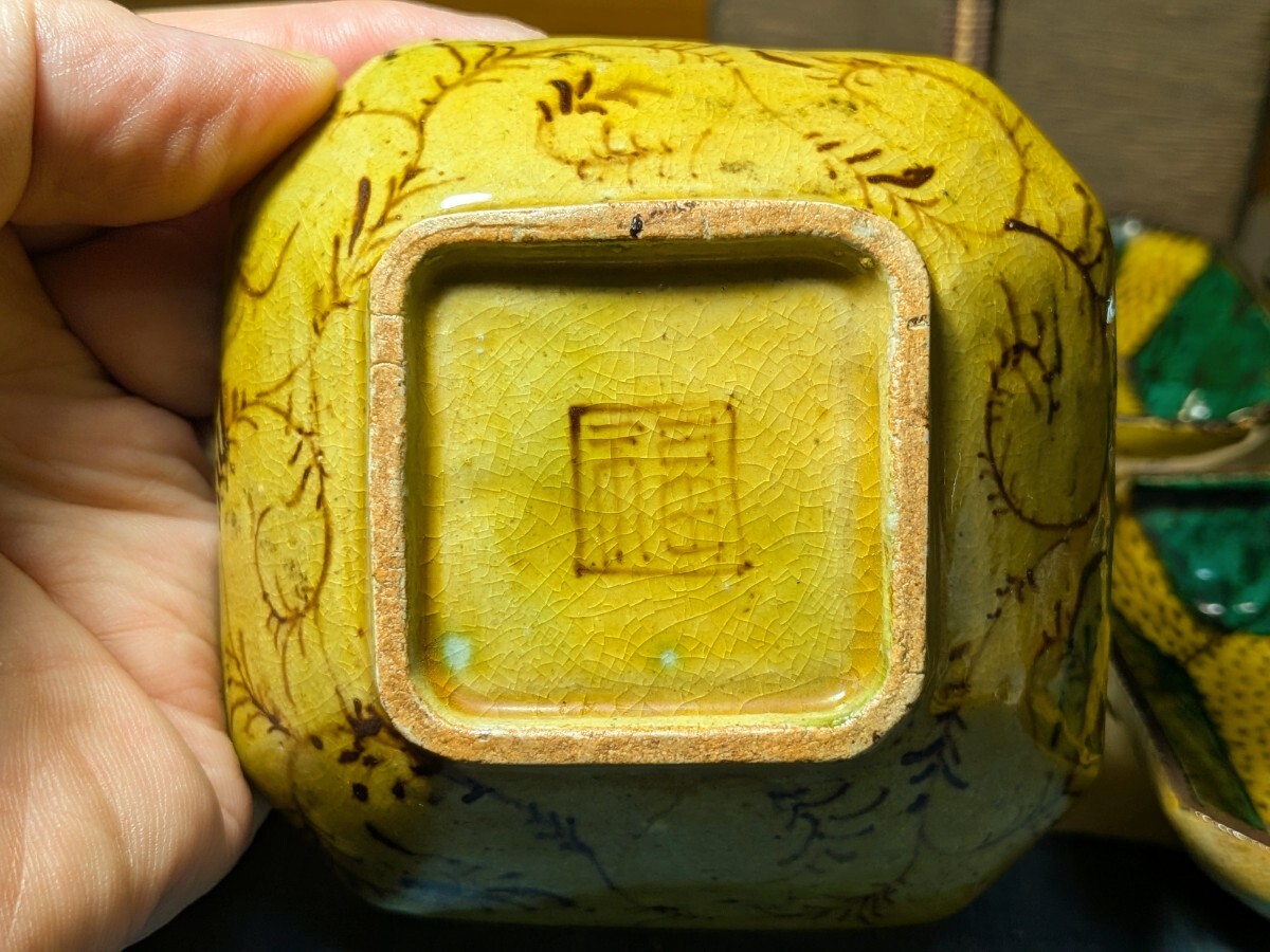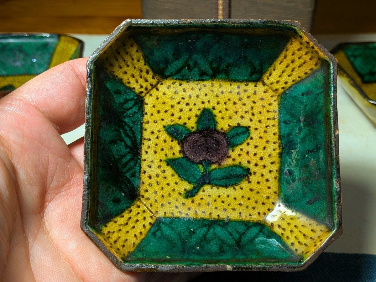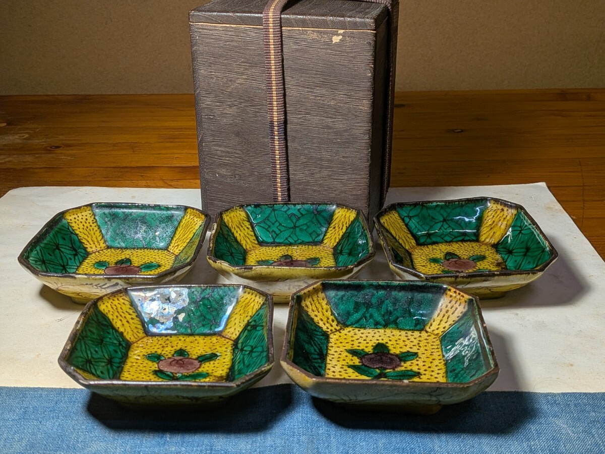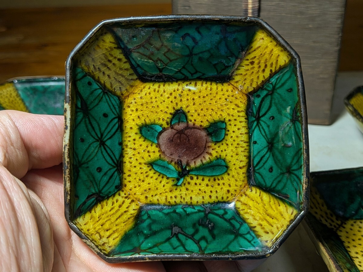 再興九谷の吉田屋窯の橘文の角小皿5客です。鉄分を含む磁器質の土、幾分黄緑に寄った黄釉、速度感のある描線、緻密な点文、角福の描き方等吉田屋窯の特徴が顕著です。1客の縁に小さな釉剥け、他の1客の縁にほつれが1か所ありますが全体的に大変良い状態です。縁の鉄を塗った部分の一部白っぽく見える所は鉄の塗り残しです。盃としても充分使用可能です。明治以降も多く写しが作られており判別の難しい物ですがこちらは安心納得の本歌吉田屋です。珍味にお酒に楽しく使える愛蔵に値する再興九谷吉田屋窯橘文角小皿5客を特別出品です。・幅8.2×8.2センチ・高さ2.7センチ・江戸後期 ※新規の方、評価の悪い方の入札は取り消す場合があります。商品到着後は速やかに取引ナビの受取連絡を入れて下さい。