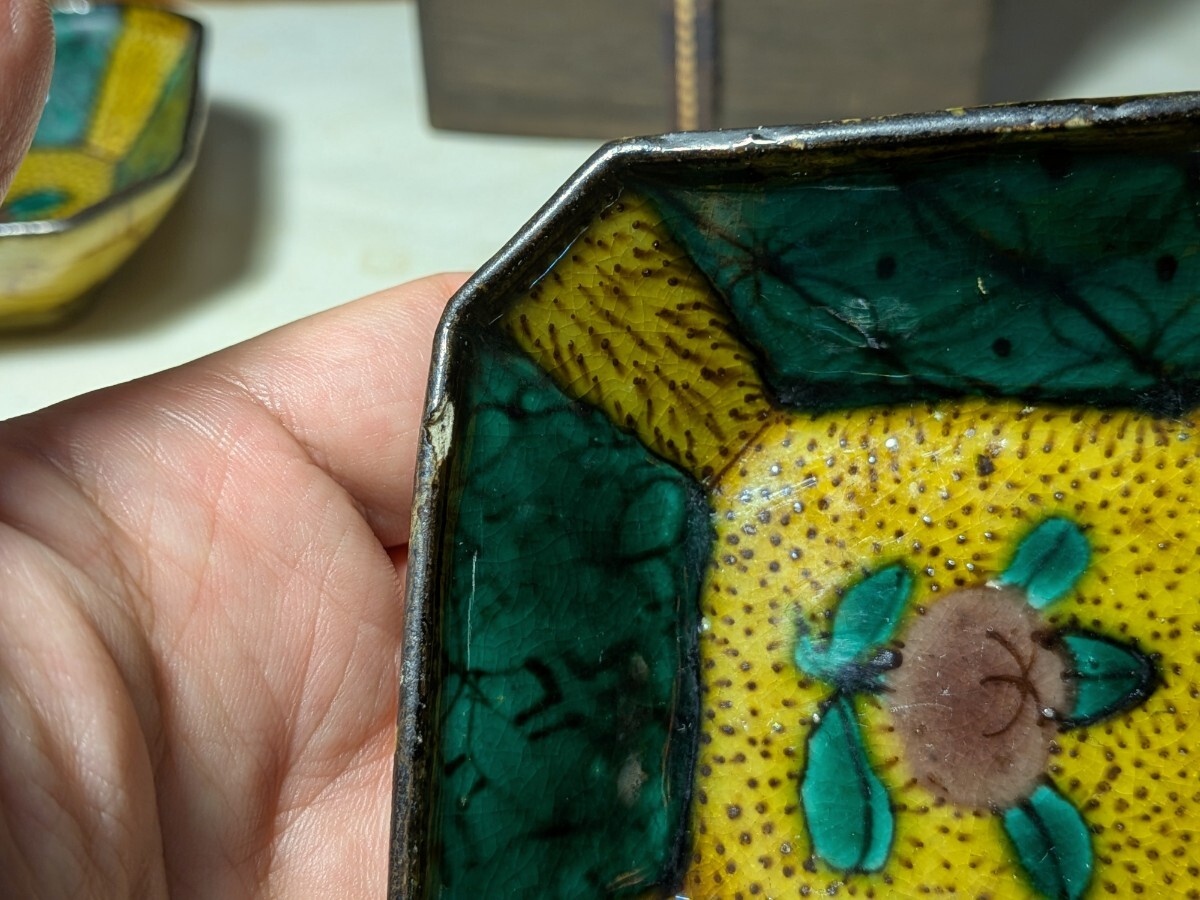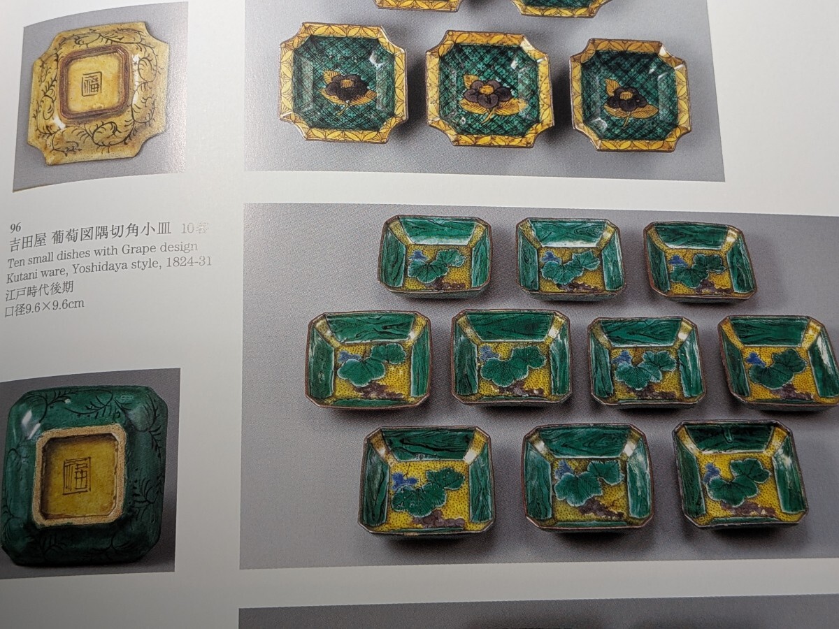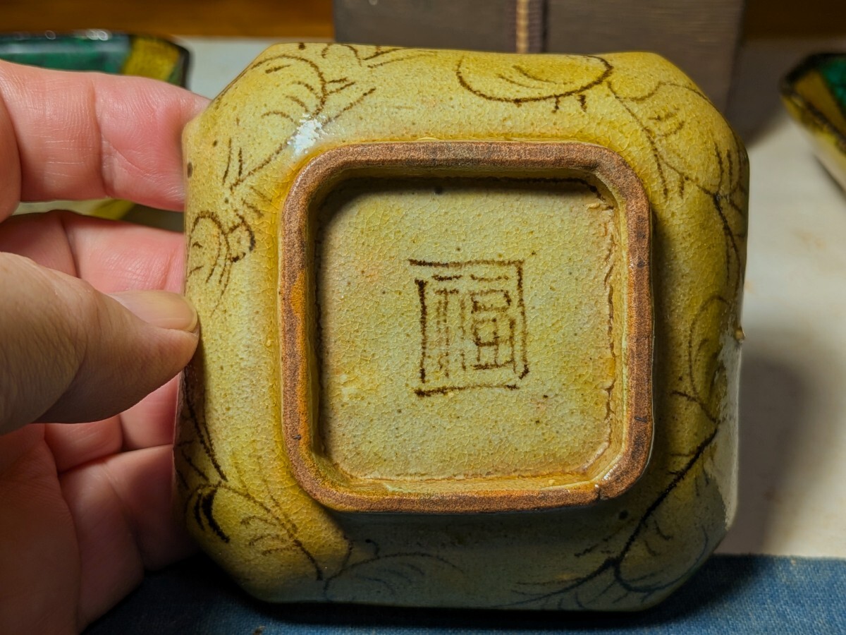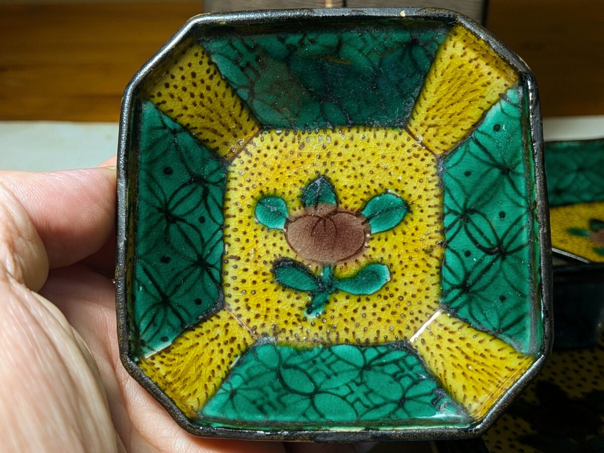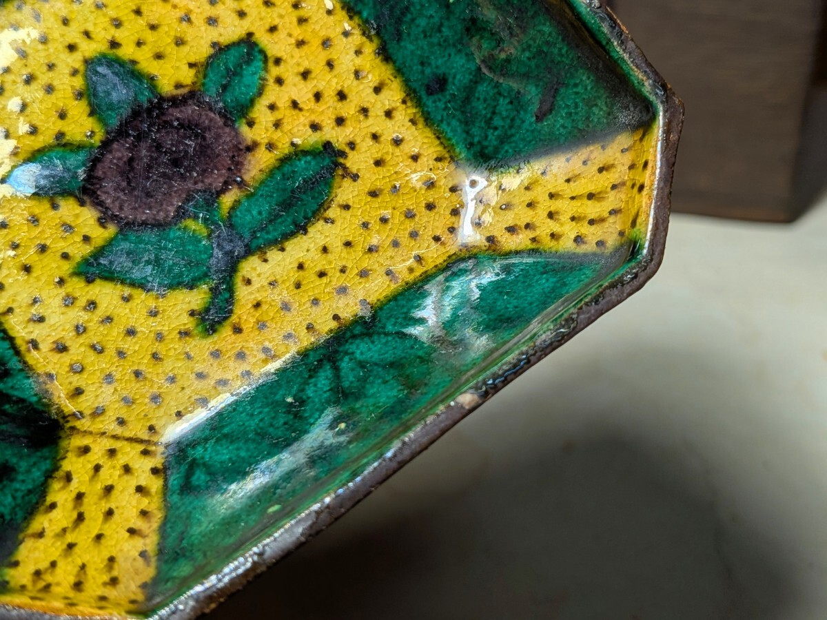 再興九谷の吉田屋窯の橘文の角小皿5客です。鉄分を含む磁器質の土、幾分黄緑に寄った黄釉、速度感のある描線、緻密な点文、角福の描き方等吉田屋窯の特徴が顕著です。1客の縁に小さな釉剥け、他の1客の縁にほつれが1か所ありますが全体的に大変良い状態です。縁の鉄を塗った部分の一部白っぽく見える所は鉄の塗り残しです。盃としても充分使用可能です。明治以降も多く写しが作られており判別の難しい物ですがこちらは安心納得の本歌吉田屋です。珍味にお酒に楽しく使える愛蔵に値する再興九谷吉田屋窯橘文角小皿5客を特別出品です。・幅8.2×8.2センチ・高さ2.7センチ・江戸後期 ※新規の方、評価の悪い方の入札は取り消す場合があります。商品到着後は速やかに取引ナビの受取連絡を入れて下さい。