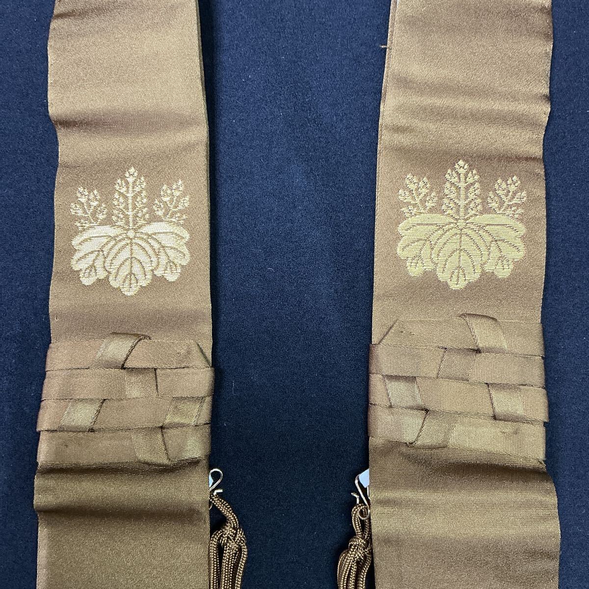 【L6B747】未使用品 真言宗 折五條袈裟 絹 茶色 五三の桐紋 金糸 法衣 法要 装束 着物 僧侶 お坊さん 箱 收藏