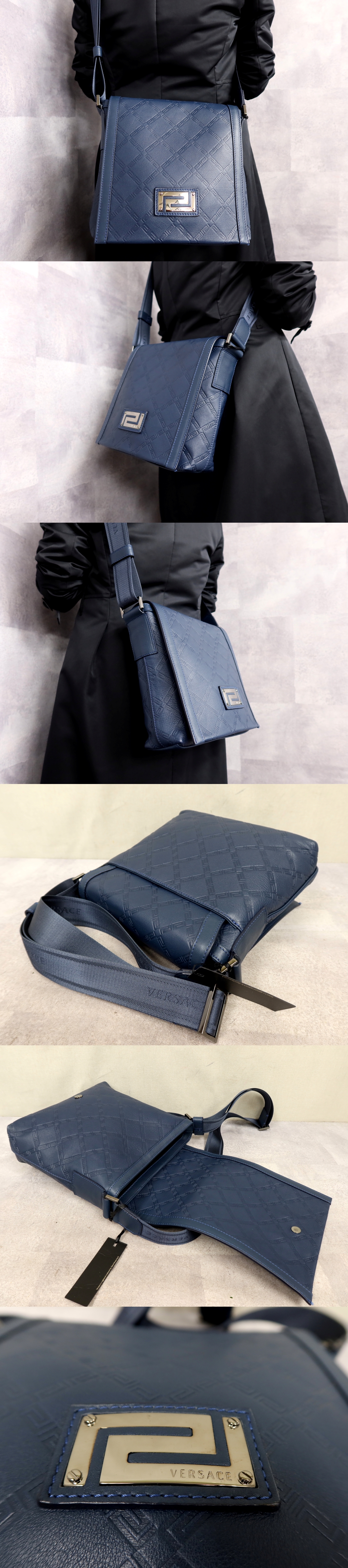 ●超美品●VERSACE ヴェルサーチ●メンズ●フラップ●ロゴ型押し●総柄●カーフ レザー 本革●ショルダー バッグ●ネイビー●B5●Js61861 收藏