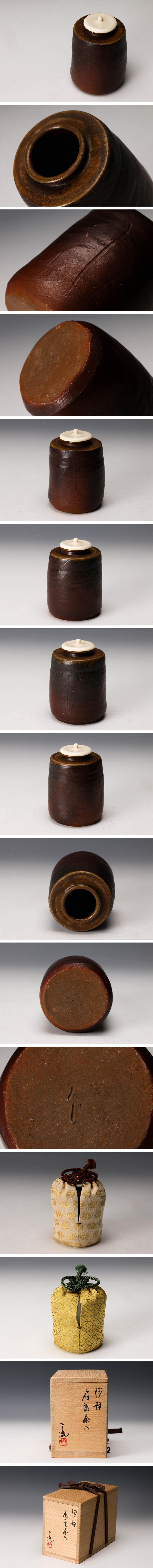 【佳香】伊勢崎満 伊部肩衝茶入 共箱 仕覆(大燈金襴) 替仕覆(遠州輪違緞子) 茶道具 本物保証 收藏
