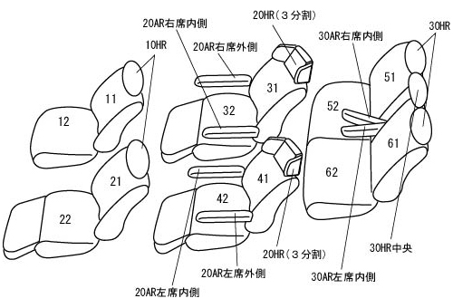 | 適合形状 | 1列目パワーシート 2列目エグゼグティブパワーシート ※1列目背もたれハーフカバー ※1列目コンソールBOXカバー無し |