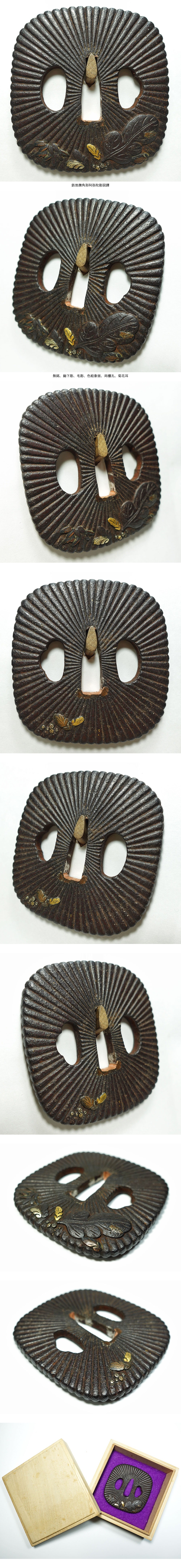 ★鉄地撫角形阿弥陀彫図鐔 無銘 鋤下彫 毛彫 色絵象嵌 両櫃孔 菊花耳 鉄鍔 刀装具 拵 外装 鍛え鐔 桐箱入 【鐔42】 收藏