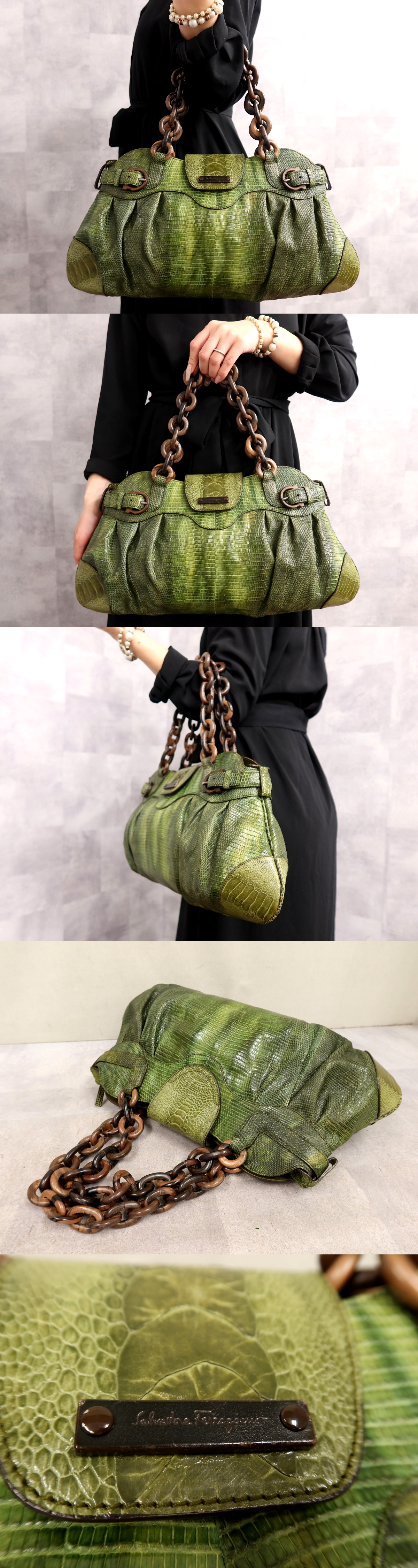 ●超美品●Salvatore Ferragamo フェラガモ●ガンチーニ●ウッドチェーン●リザード 本 トカゲ 革●ハンド バッグ●グリーン●Js66632 收藏