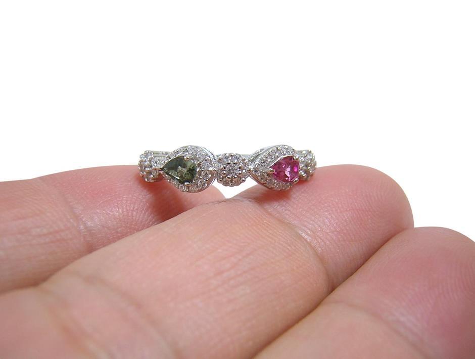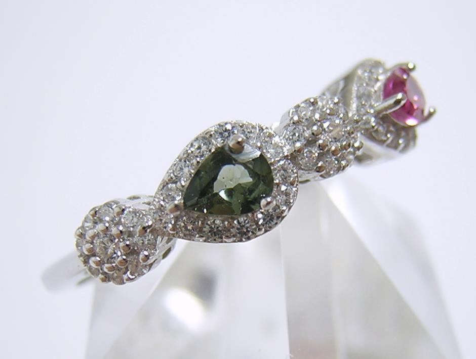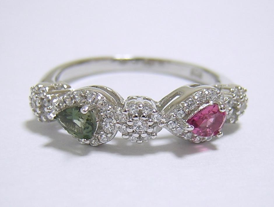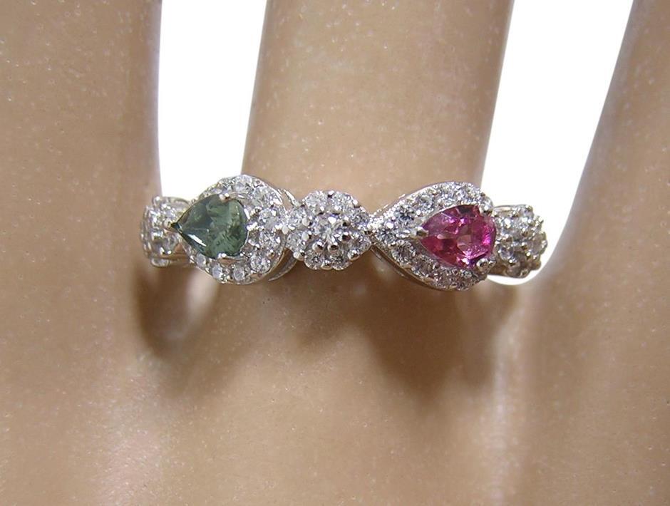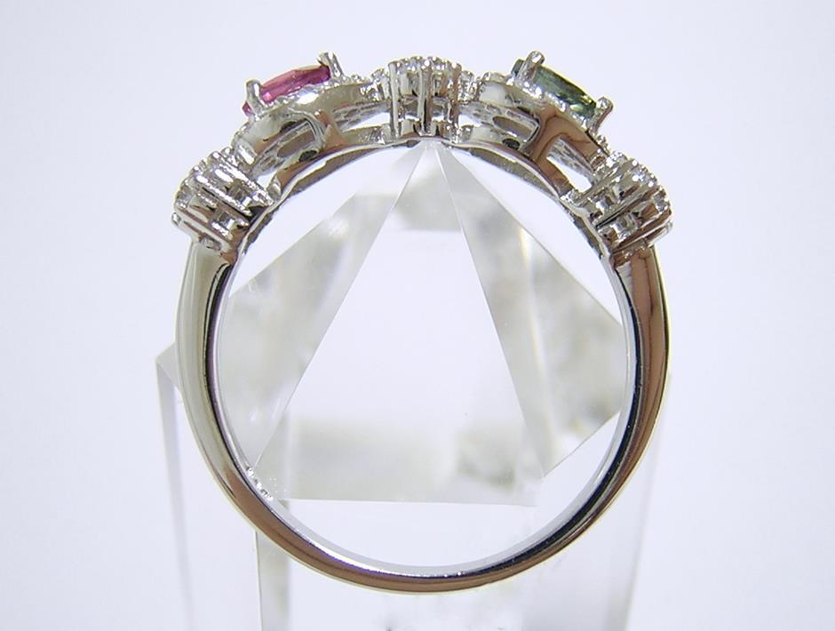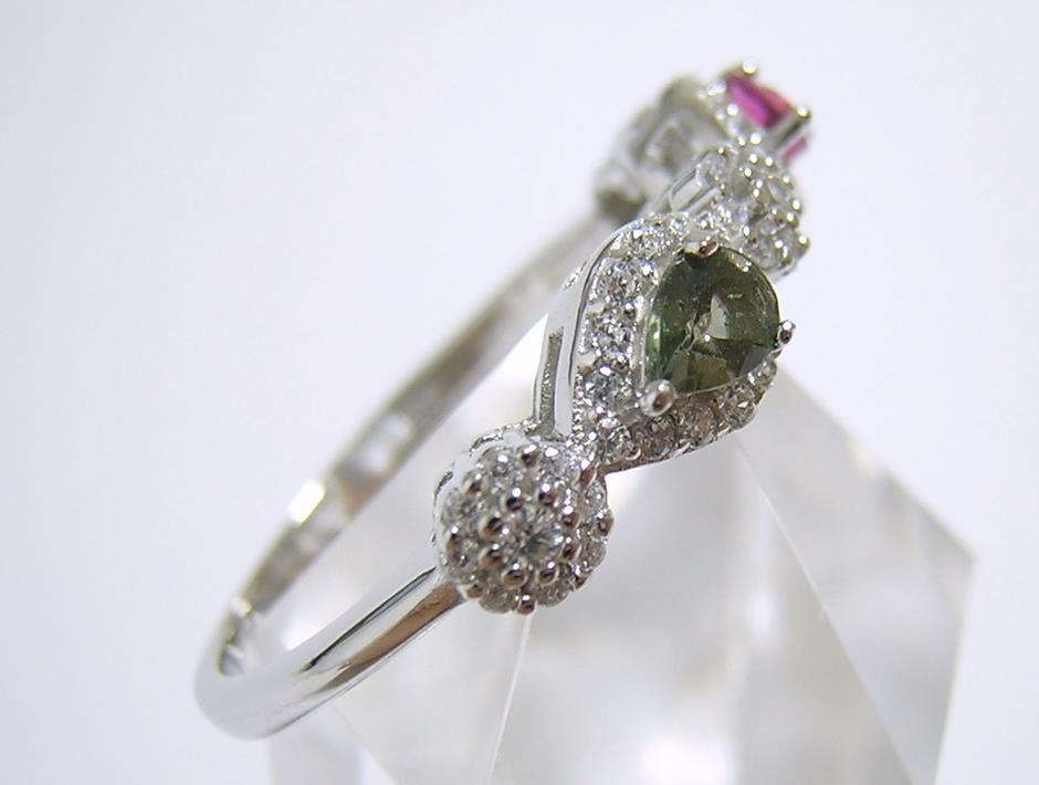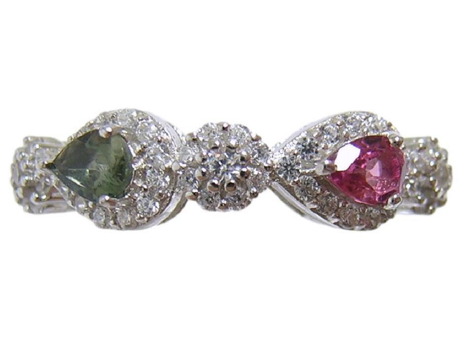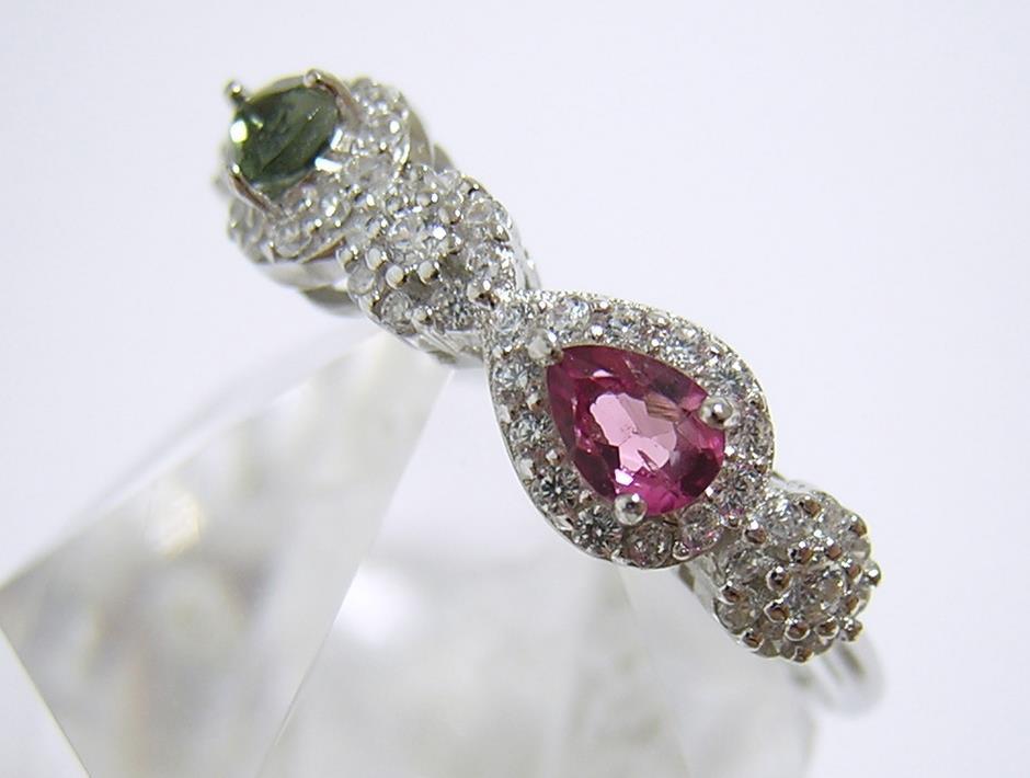 天然ピンクトルマリンとグリーントルマリン、キュービックジルコニアを使用したデザインリングです。
