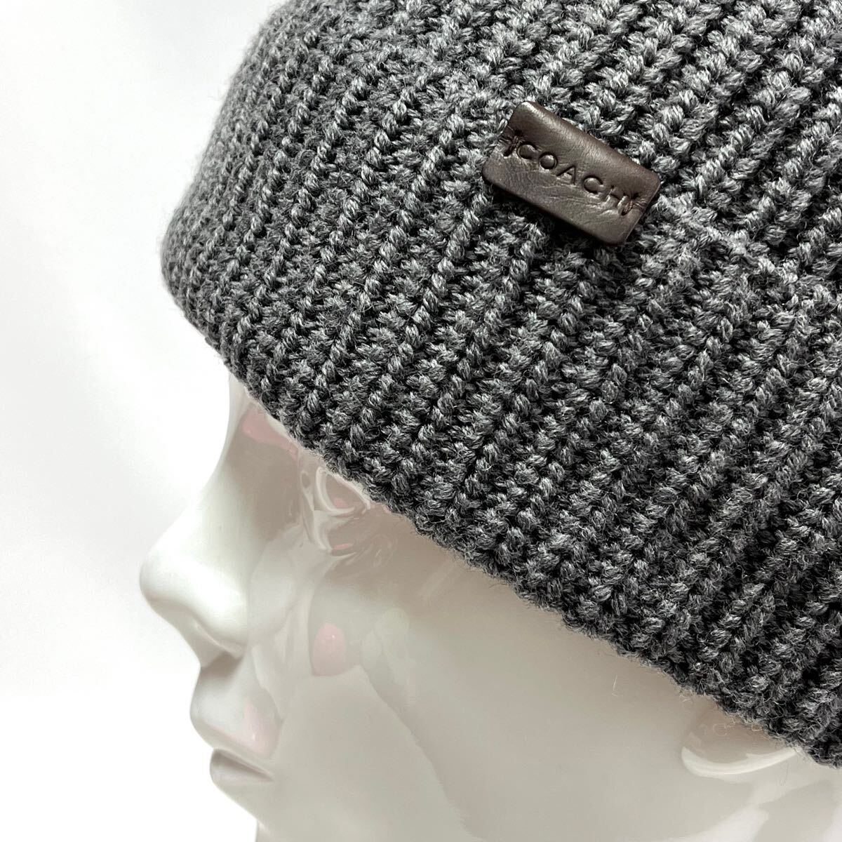 【新品】COACH コーチ レザーピスネーム付き 2WAY着用可能 上質ウールリブニットキャップ/ビーニー チャコール フリーサイズ ユニセックス 收藏