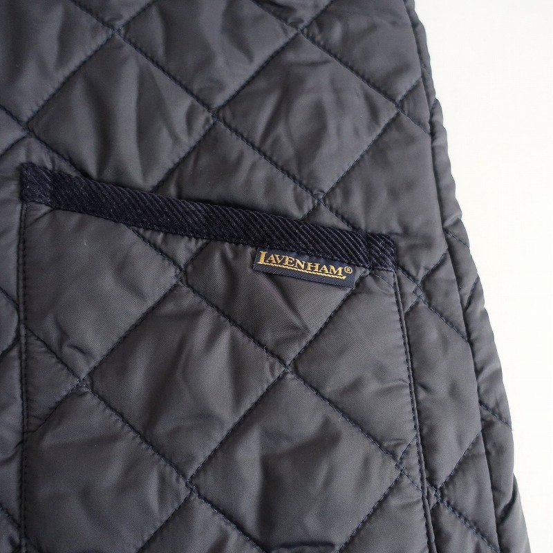 | LAVENHAMのキルティングジャケットです。カラーはネイビーで、薄手のキルティング地で仕立てられており、コーデュロイのパイピングが施されております。フロントはブランドロゴ刻印入りのスナップボタン仕様で、左胸に内ポケット、両腰にポケットが付いており、バックベンツ入りです。 |