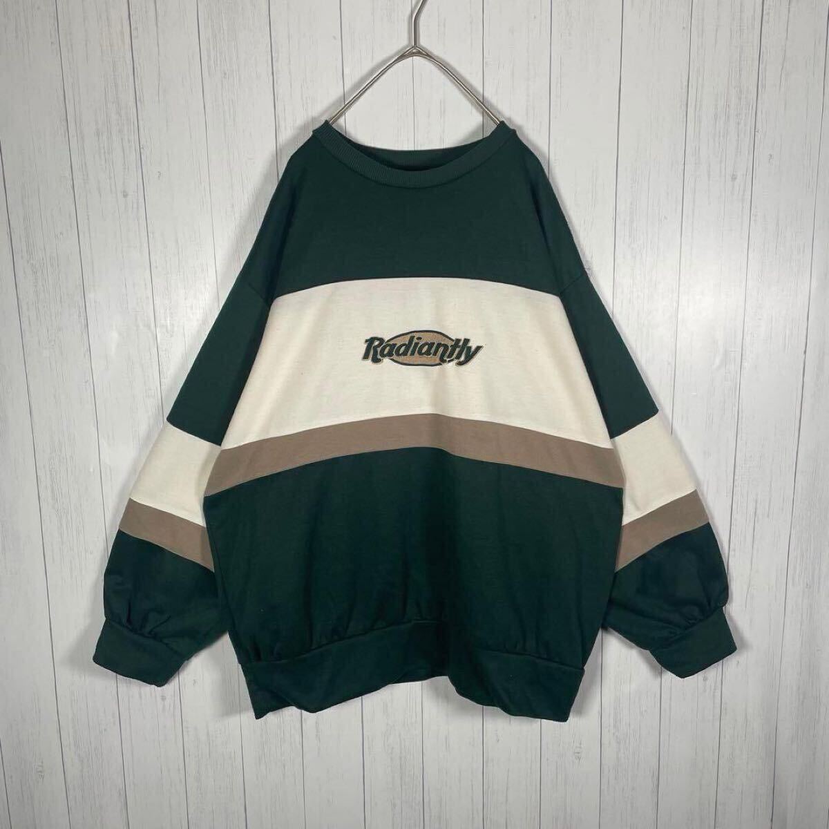 ビンテージ トレーナー 刺繍デザイン アームライン ヴィンテージ スウェット 太アーム 良配色 グリーン ブラウン ホワイト L 收藏