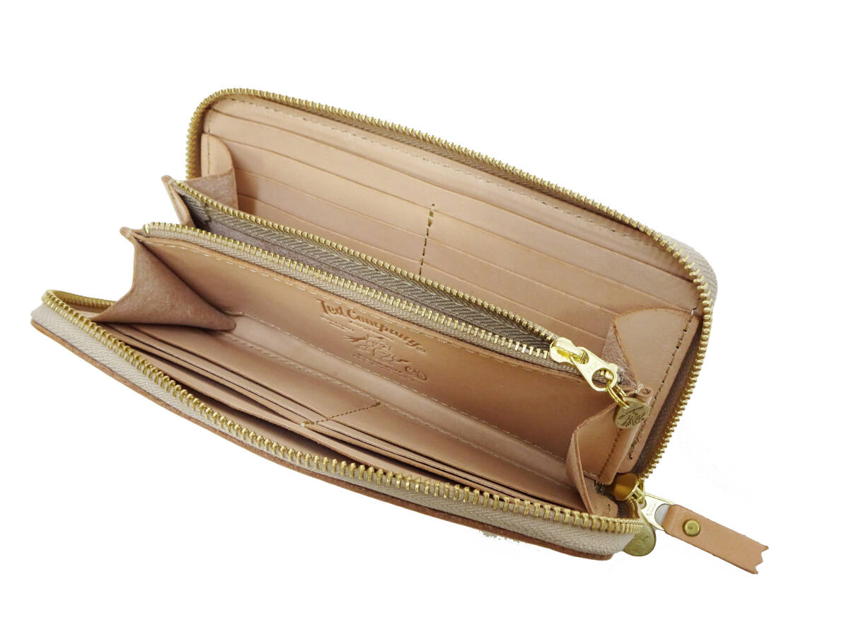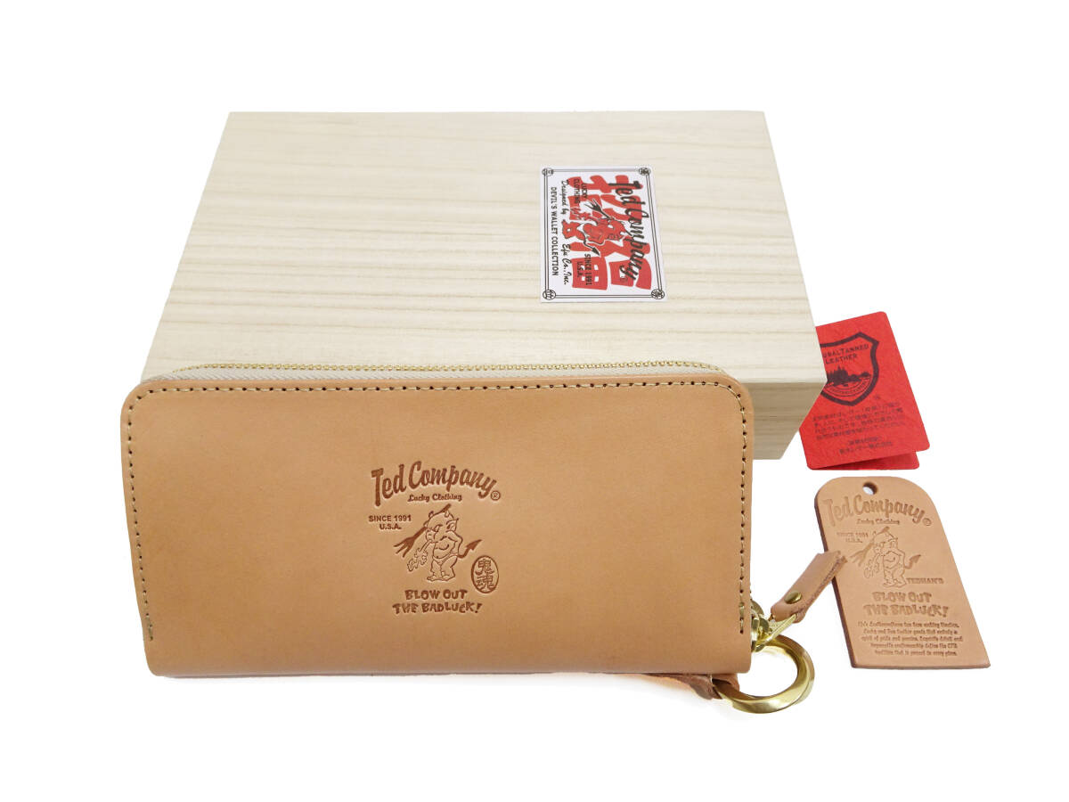 2つ折り(バイフォールド)のロングウォレットで、開閉は3方ラウンドファスナー仕様です。ジップにはゴールドの「YKKジップ」が採用されています。ファスナーの引手にはレザータブとテッドマンの刻印プレートが付きます。