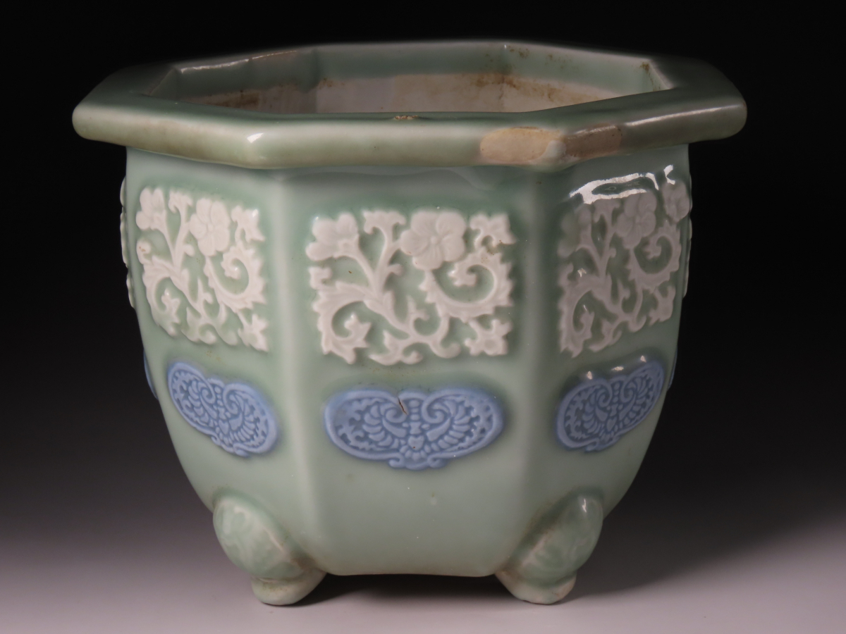 【ONE'S】古美術 時代本歌 瀬戸 尾張 祖洞園池勝製 最高峰作品 青磁貼花花唐草文四足八角鉢 幅24.5cm 盆栽鉢 植木鉢 古美術品 | |||