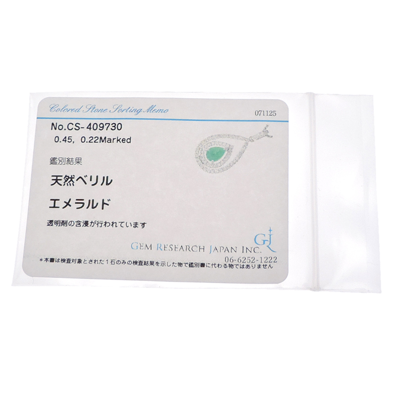| 品名 | 0.45ct エメラルド 0.22ct ダイヤモンド ネックレス K18ホワイトゴールド グリーン系 |