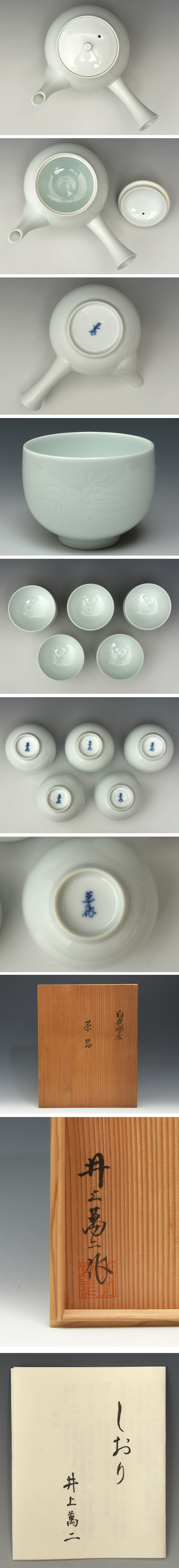 人間国宝 井上萬二 (造) 白磁 彫文 茶器 一揃 / 急須 湯呑 5客/ 共箱 しおり 煎茶道具 茶道具 陶磁器 (検) 伊万里 有田 |