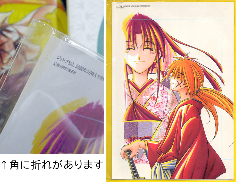 集英社 【【ばら売りOKです】】 質問欄などからご要望ください。 出品回の終了後に改めて出品しなおします。 その回に落札が決定してしまった場合にはご容赦ください。 ①流浪人 動画版(アニメ版)るろうに剣心 傑作画集 297x210x5㎜ 約390g 1999初版発行 状態:表紙スレ、小口に少傷 ②るろうに剣心 剣心草紙 巻之弐 総天然色 電影画帖 アニメコレクション 260x180x8㎜ 約317g 1998初版発行 カードはありません。 表紙カバーの一部に破れ、軽い汚れ、表面・角・カバー天地にスレ、ヨレ、 ③全史 るろうに剣心 剣心華伝 週刊少年ジャンプ特別編集 260x180x12㎜ 約480g 2003 重版発行 表紙カバー・小口にシミ、カバー表面に汚れ ④ジャンプSQ 2020年5月特大号 特別付録 週刊少年ジャンプ1999年43号 扉用イラスト (コミックス28巻表紙イラスト)複製原画 255x175㎜ 外袋未開封。角に軽い折れ。 ⑤ジャンプSQ 2019年3月特大号 特別付録 クリアファイル 外袋未開封。特に問題ありません。 ⑥おまけとして、1995年ごろの週刊少年ジャンプ表紙・カラーページ 3枚 状態は、一部画像にてご確認ください。 外観の印象等は当方の主観によるところですので、著しく違わない限りは ご理解いただけますと幸いです。 経年品であることが前提の出品です。 見落としから上記に記載のない傷みがある可能性もありますが、 状態が理由の返品・返金はお控えください。 2509 | ||||