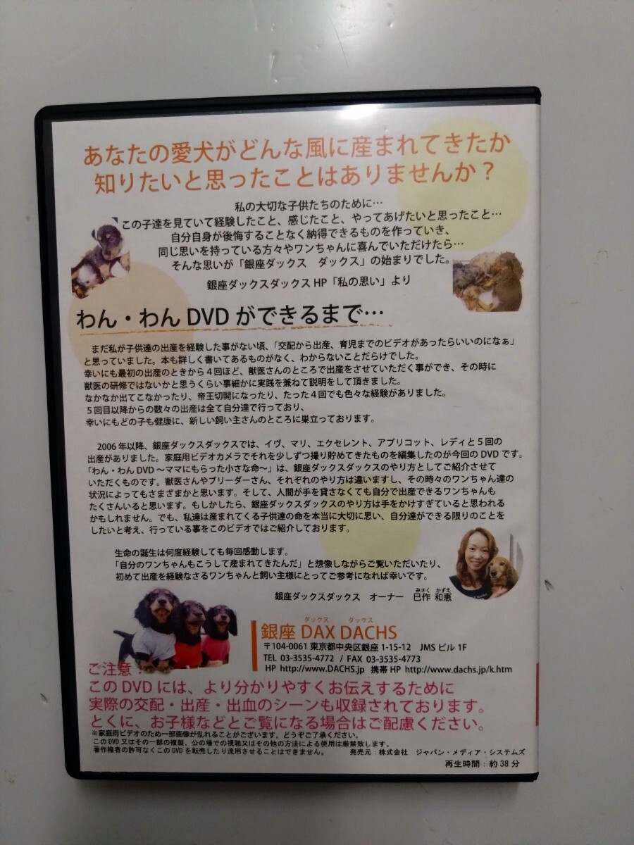わんわんDVDミニチュアダックス~ママにもらった小さな命~ 銀座DAX DACHS 中古です。ディスク(DVD-R)、ケースの出品です。中古ですがディスクキズ汚れ少ないです。発送は定形内270円サイズです。中古ですのでノークレームノーリターンです。