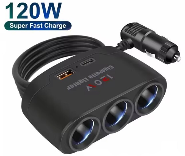 シガーライター 3連ソケット シガーソケット 120W USB充電ポート付 TypeC+TypeA 3口分岐 スプリッター 12V 24V 電源アダプター 收藏