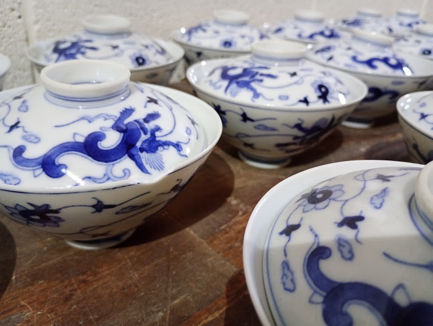 ♪《引き取り限定》《旧家蔵出し》蓋付き茶碗まとめ大量/ 22点 春峰園 染付 昭和レトロ 当時物 陶器製 和食器 收藏