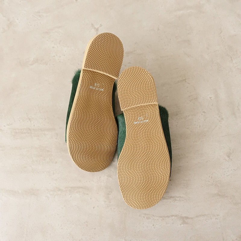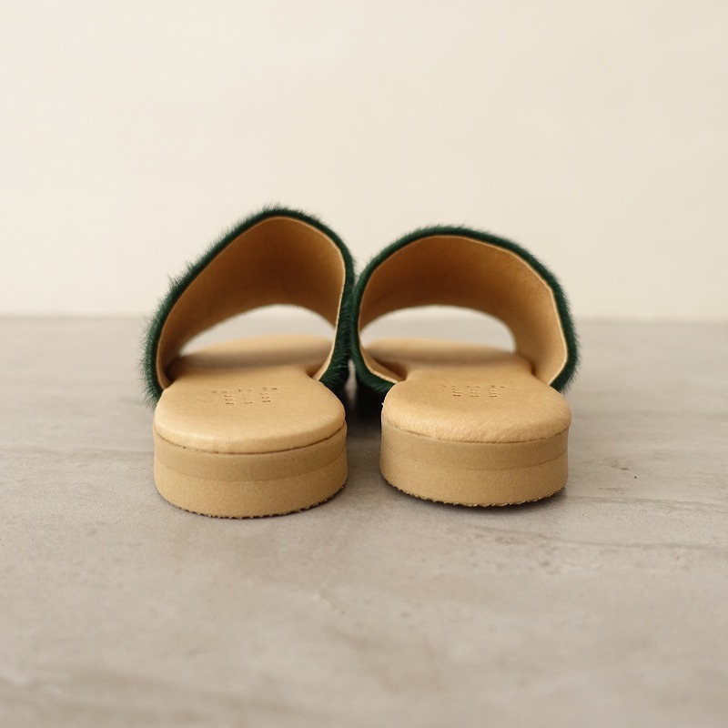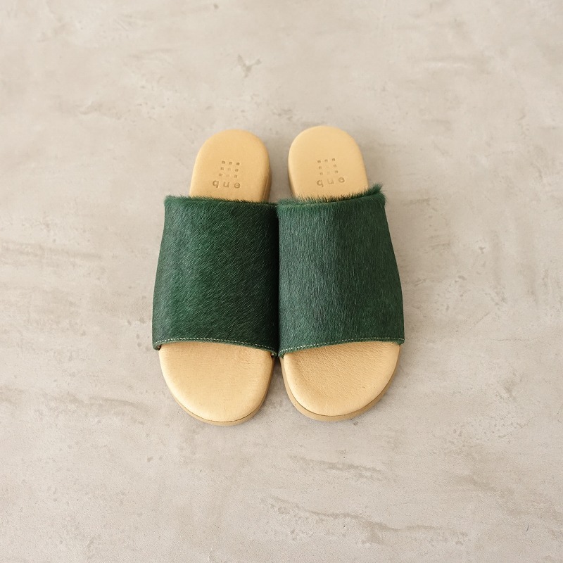 | queのオープントゥサンダルです。カラーは少しムラ感のあるダークグリーンで、ハラコレザー素材です。インソールはライトブラウンで、クッション性がございます。オープントゥタイプで、シンプルなデザインです。 |