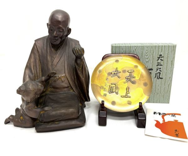 旧家蔵出 玉川堂 飾額 在銘 米治一 作 銅製 良寛像 2点まとめてセット 「良寛 毬と童子」 高さ約26cm 茶道具 無形文化財 茶道具 人間国宝 收藏