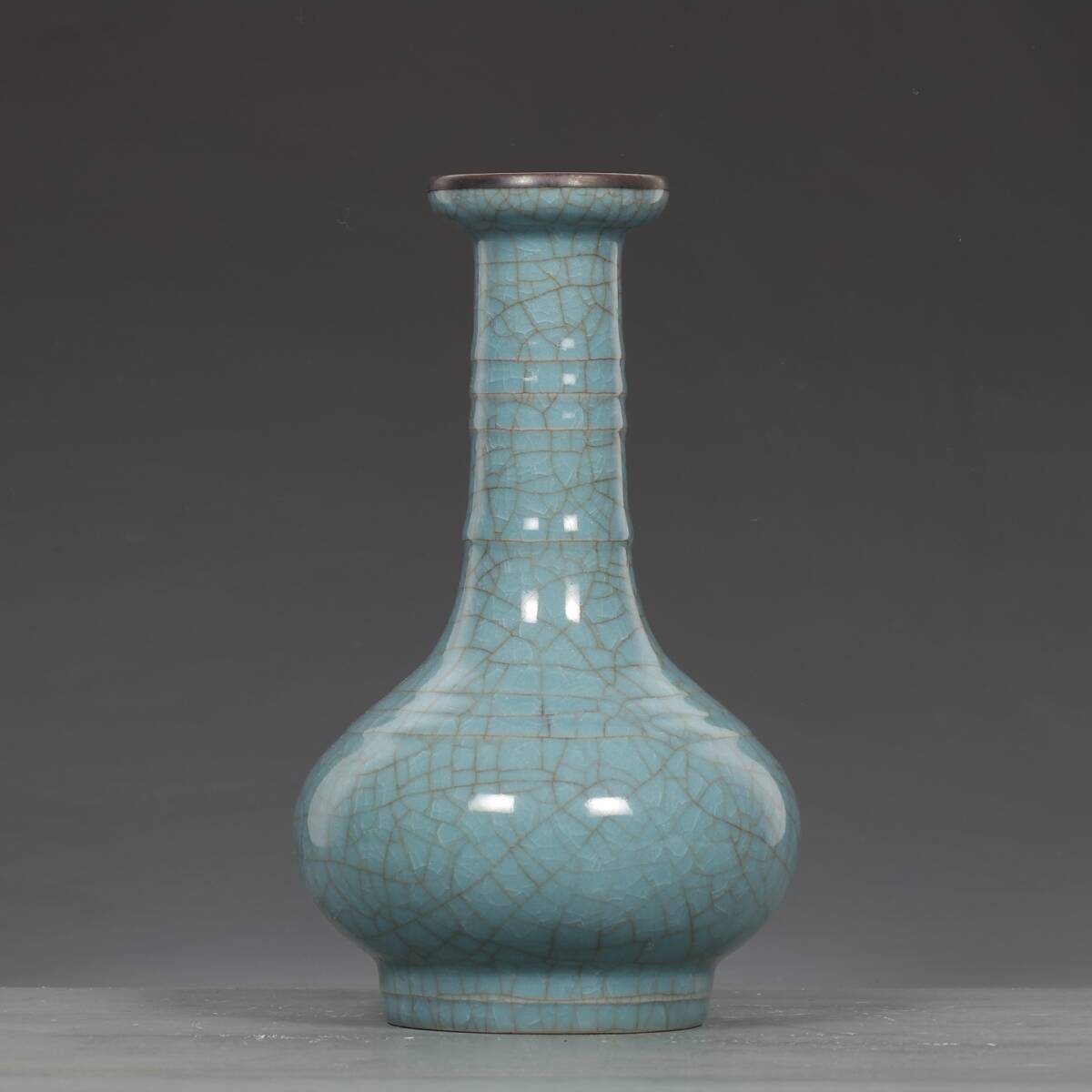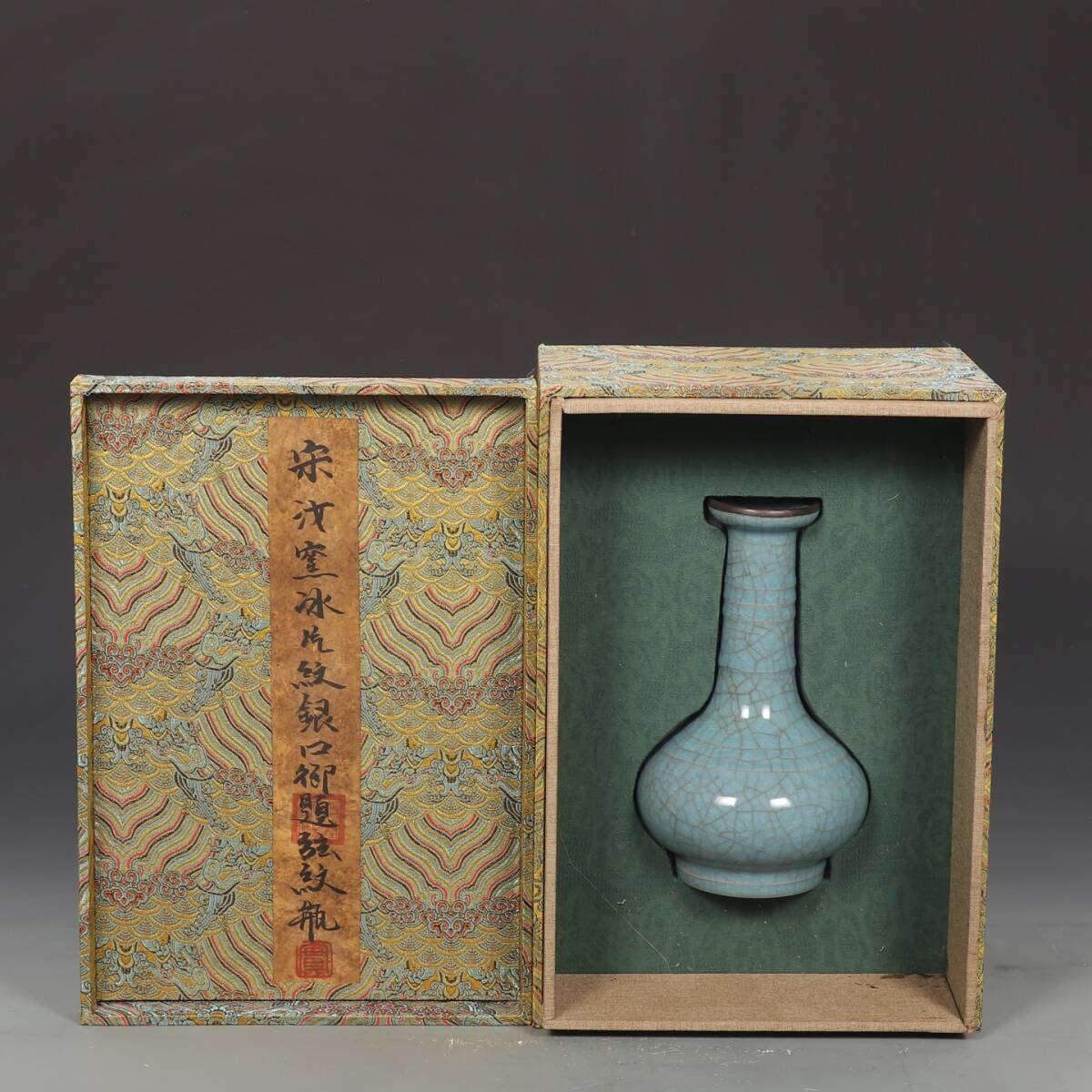 PTA#1253【3.1】中国骨董 人間国宝 磁器【旧蔵宋汝窯氷片紋銀口御題弦紋瓶】工芸品 施釉陶 青花磁 陶芸 精美彫 置物 收藏品 收藏